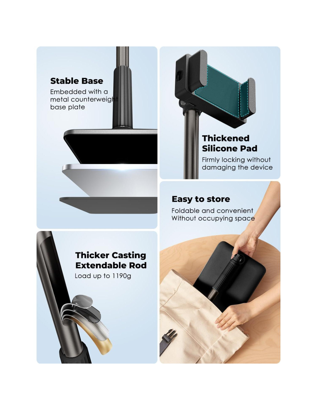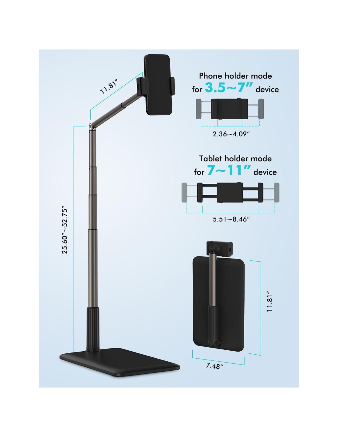- [Estable y Duradero] El rango de altura ajustable es de 25.6-52.75 pulgadas (65cm-134cm). La base es fuerte y estable y no se volcará. El soporte está hecho de aleación de aluminio de alta calidad y aleación de magnesio, lo que hace que el brazo sea lo suficientemente resistente para sostener firmemente el teléfono y la tableta, pero flexible para doblarse 85 grados en cualquier dirección para acomodar su vista. (Nota: al retraer el poste principal en el poste telescópico, debe alinear las ranuras en el poste principal para retraerlo.)