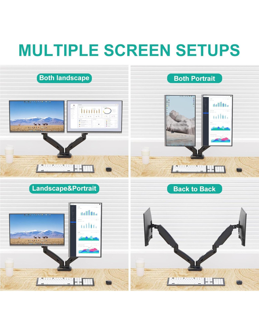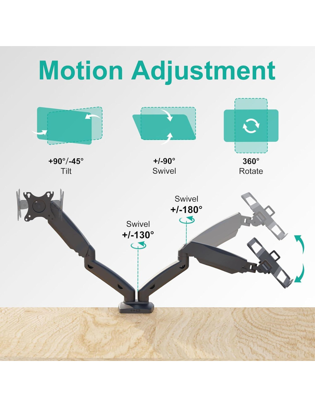 - Soporte para Laptop con Múltiples Ajustes: Los brazos de alta calidad se extienden hasta 19.9" (50,29 cm) de largo y se elevan hasta 16" (40,64 cm) de altura, los brazos del Soporte de Escritorio para Doble Monitor se retraen y son fácilmente ajustables en un poste de 16" (40,64 cm) de altura, proporcionando +/-90 de inclinación y giro para cambiar el ángulo de lectura, y rotación de 360 de modo paisaje a modo retrato