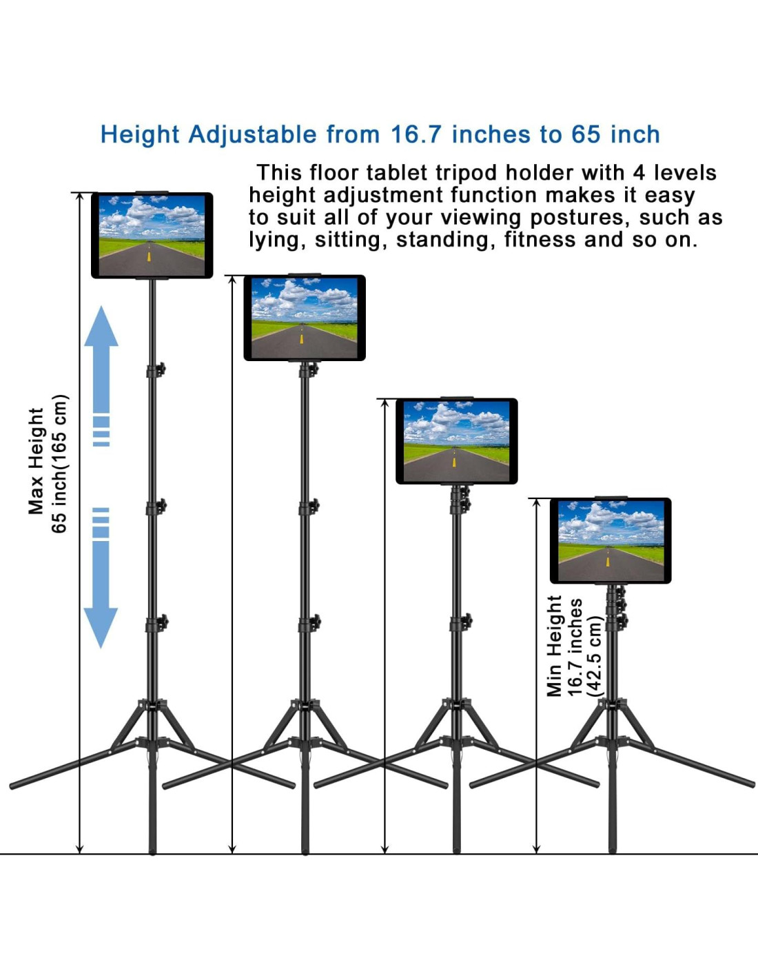 - Altura ajustable: Este soporte de trípode de tabletas de piso tiene una función de ajuste de altura de 4 niveles de 16.7 pulgadas (42.5 cm) a 65 pulgadas (165 cm), lo que hace que este soporte de trípode para iPad sea fácil de adaptar a todas tus posturas de visualización, como acostado, sentado, de pie, haciendo ejercicio, etc. Regalos de Navidad.