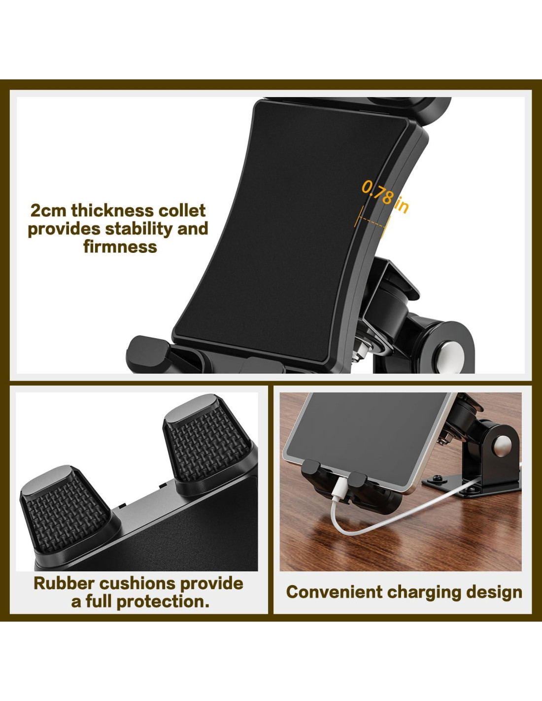 - Diseño Único y Protección: En comparación con los soportes de tablet ordinarios, el soporte de tablet de metal no tiene un brazo de soporte excesivamente largo, lo que no causará inestabilidad general. La base está hecha de un material metálico sólido y duradero, que es muy duro y fuerte, las almohadillas de espuma en el soporte de tablet son antideslizantes y de baja fricción, por lo que no se deslizará ni rayará tu dispositivo con o sin una funda protectora.