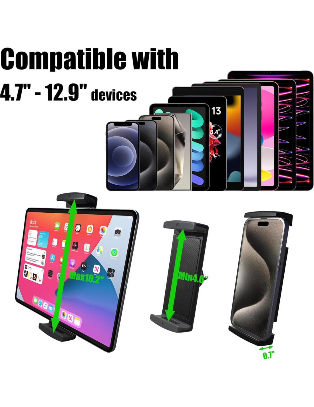 - Robusto y Estable: El soporte para tablet cuenta con una base de cabeza esférica de aleación de aluminio resistente, proporcionando un rendimiento resistente a la oxidación, anticorrosión y duradero. La abrazadera para tablet de ABS, con almohadillas de goma antideslizantes integradas, sostiene de manera segura la tablet en su lugar, evitando que se deslice o caiga.