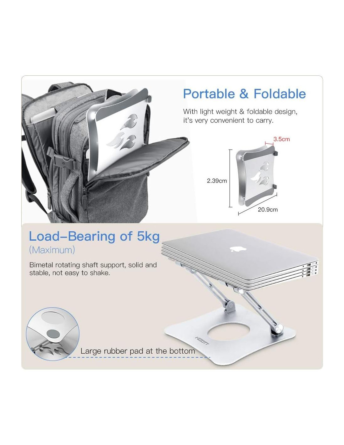 - Soporte para Laptop Robusto, Plegable y Portátil Este soporte para laptop está hecho de una aleación de aluminio premium de 3 mm, que es bastante robusto y soporta hasta 11 lbs (5 kg) de peso en la parte superior. Con grandes almohadillas de goma en la superficie superior y un borde frontal para mantener tu laptop estable en su lugar y proteger al máximo tu dispositivo de cualquier rasguño y deslizamiento. Plegable para ahorrar espacio y facilitar el almacenamiento.