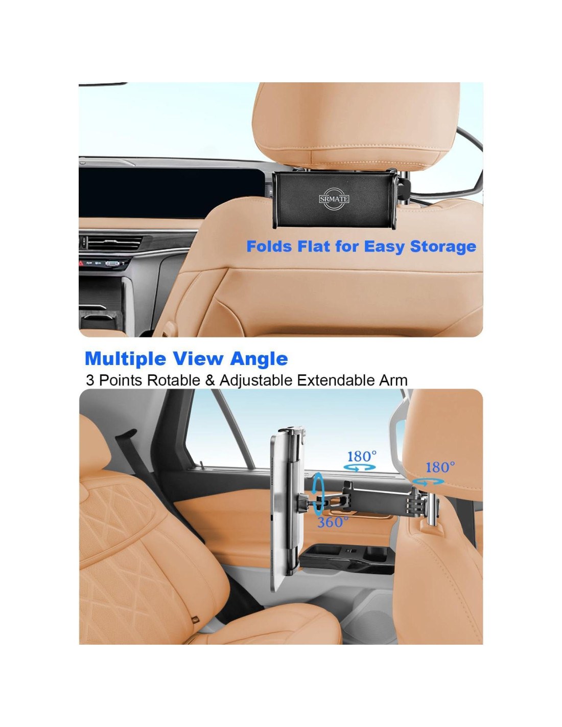 - [Rotación de 360 y Brazo Ajustable] El soporte de tablet para reposacabezas tiene una bola giratoria para rotación de 360 grados y un brazo extensible ajustable. Así que puedes obtener fácilmente el mejor ángulo de visualización para ver en modo retrato o paisaje. El brazo extensible alcanza hasta 8.6 pulgadas (21,84 cm), permitiendo a los niños acercar la tablet o colocarla entre dos asientos, permitiendo que varios niños usen la tablet al mismo tiempo durante largos viajes por carretera.