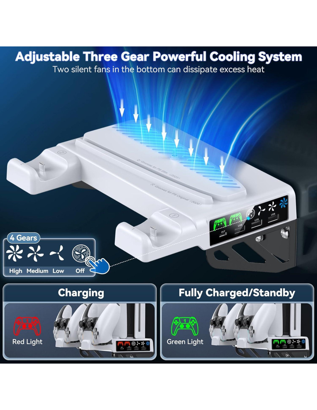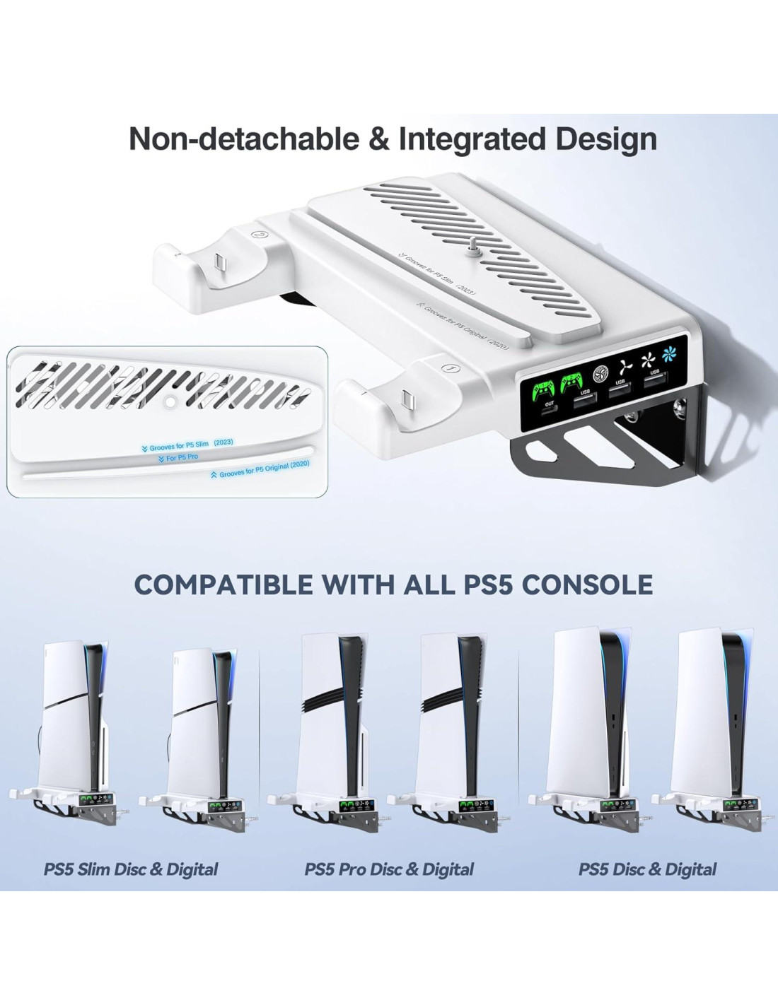 - Soporte de Pared Versátil para Todas las Consolas PS5. El soporte de pared para PS5 con carga y ventilador de enfriamiento está diseñado para PS5 disco y digital original, PS5 slim disco y digital, PS5 pro disco y digital. Viene con un sistema de enfriamiento eficiente, un cargador de controladores dual, un soporte para auriculares y un puerto USB adicional para cargar otros dispositivos.