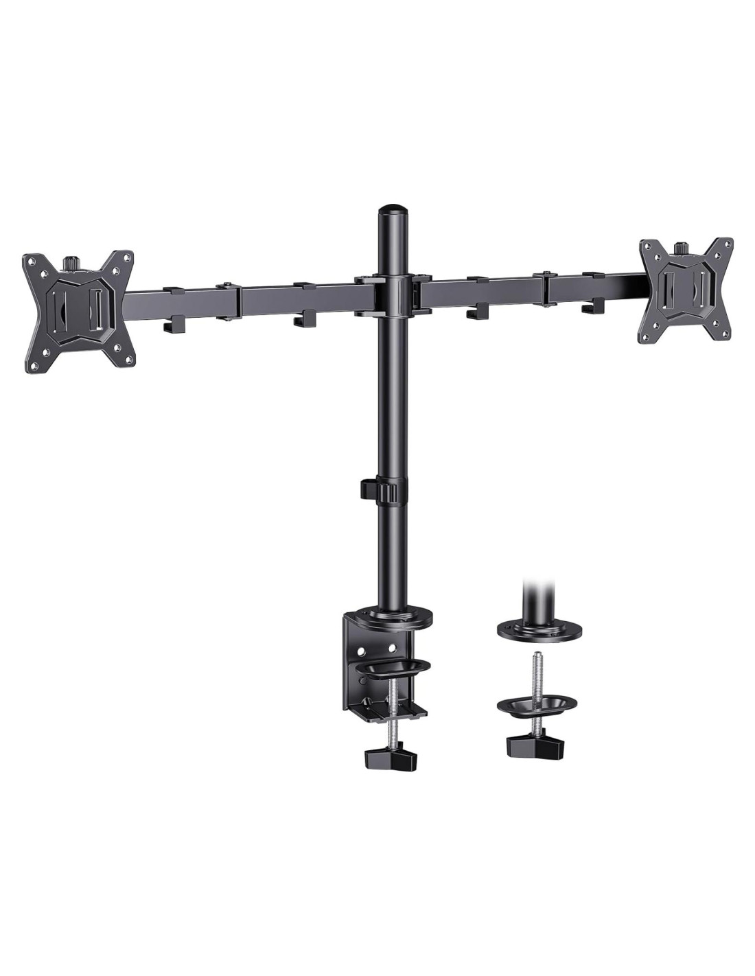 - Compatibilidad con Computadoras - Para asegurar la compatibilidad del soporte de doble monitor, cada uno de sus monitores debe cumplir tres condiciones: Primero, rango de tamaño de pantalla: de 13 a 34 pulgadas. Segundo, límite de peso de pantalla: 26.5 lbs (12,02 kg). Tercero, debe haber agujeros de montaje VESA en la parte posterior de la pantalla del monitor que estén espaciados a 75x75 mm o 100x100 mm. Asegúrese de que su monitor cumpla con todas las condiciones anteriores antes de comprar, si aún tiene dudas, puede solicitar ayuda al servicio al cliente.