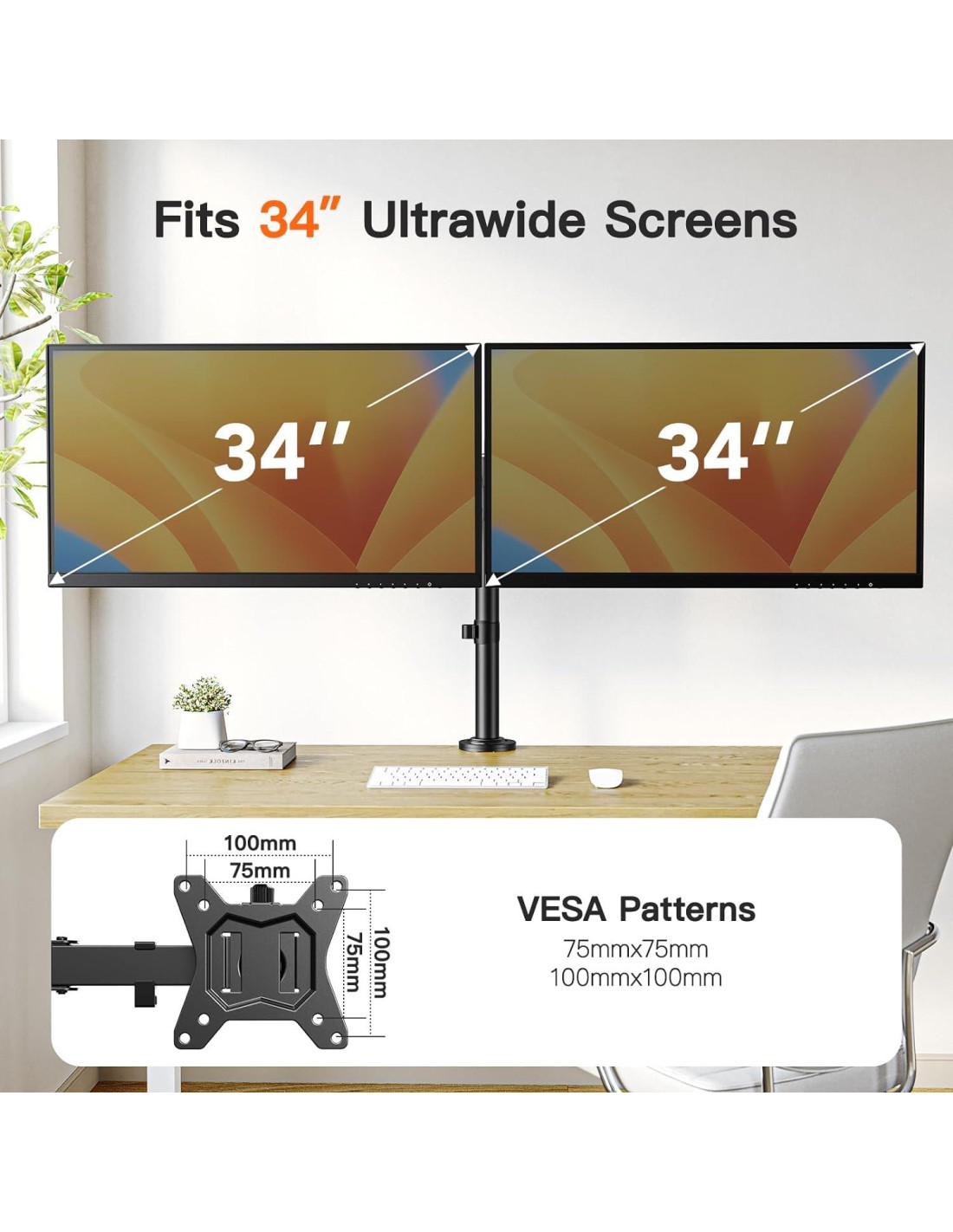 - Compatibilidad Versátil - Con un brazo de 33" (83,82 cm) de ancho y una barra de 16.3" (41,40 cm) de alto, este brazo de monitor doble acomoda dos monitores extra anchos de 34", proporcionando una gran cantidad de ajustabilidad para su uso laboral y permitiéndole disfrutar de una experiencia de visualización inmersiva.