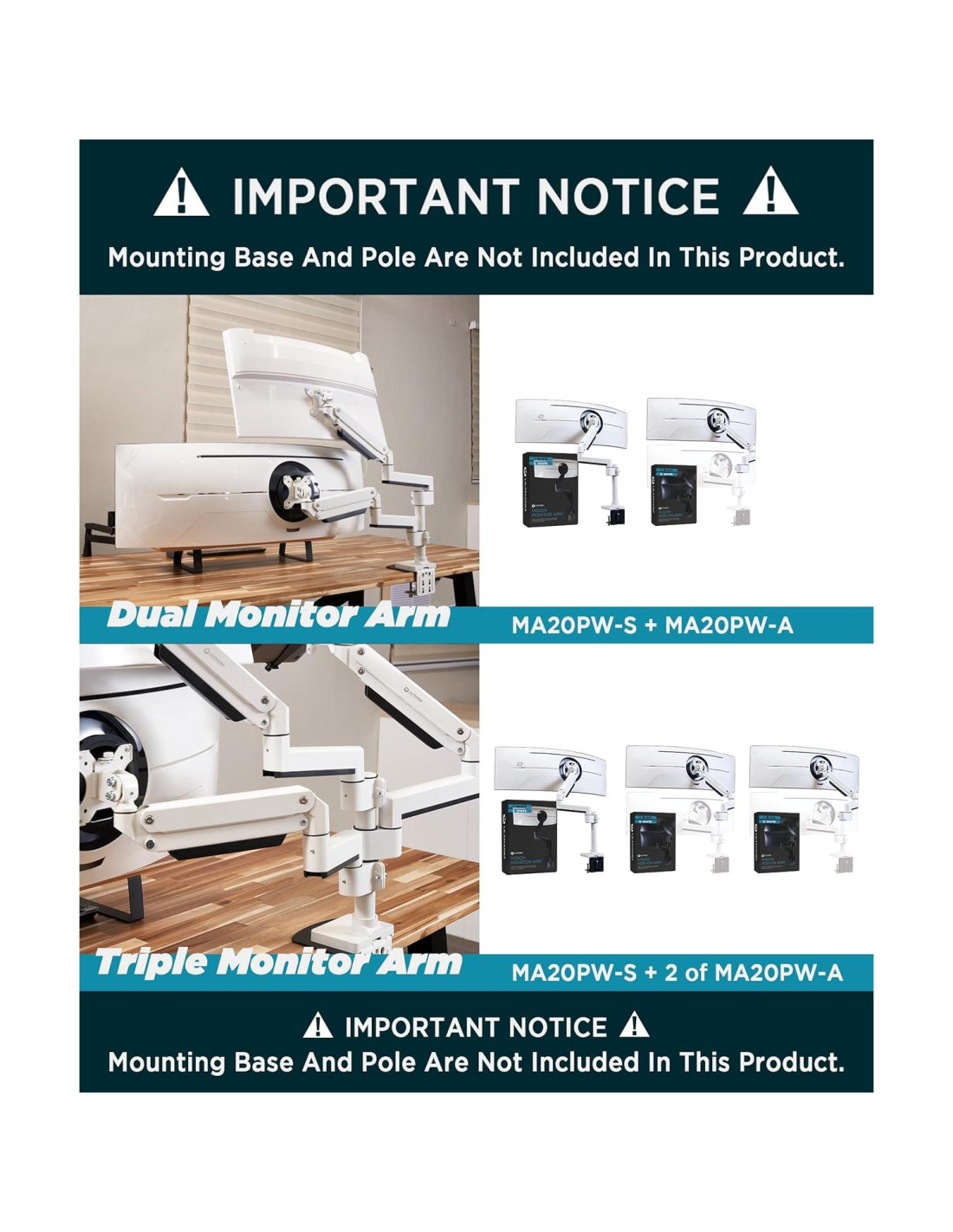 - [Accesorio Solo - Requiere MA20P-S Brazo de Monitor Individual para Uso] Montaje de Brazo de Monitor Alto - Montaje de brazo pesado premium ULTRARM con sistema de resorte neumático incorporado para un ajuste de peso perfecto, gestión de cables clara y una placa VESA de liberación rápida para una instalación simple del monitor.