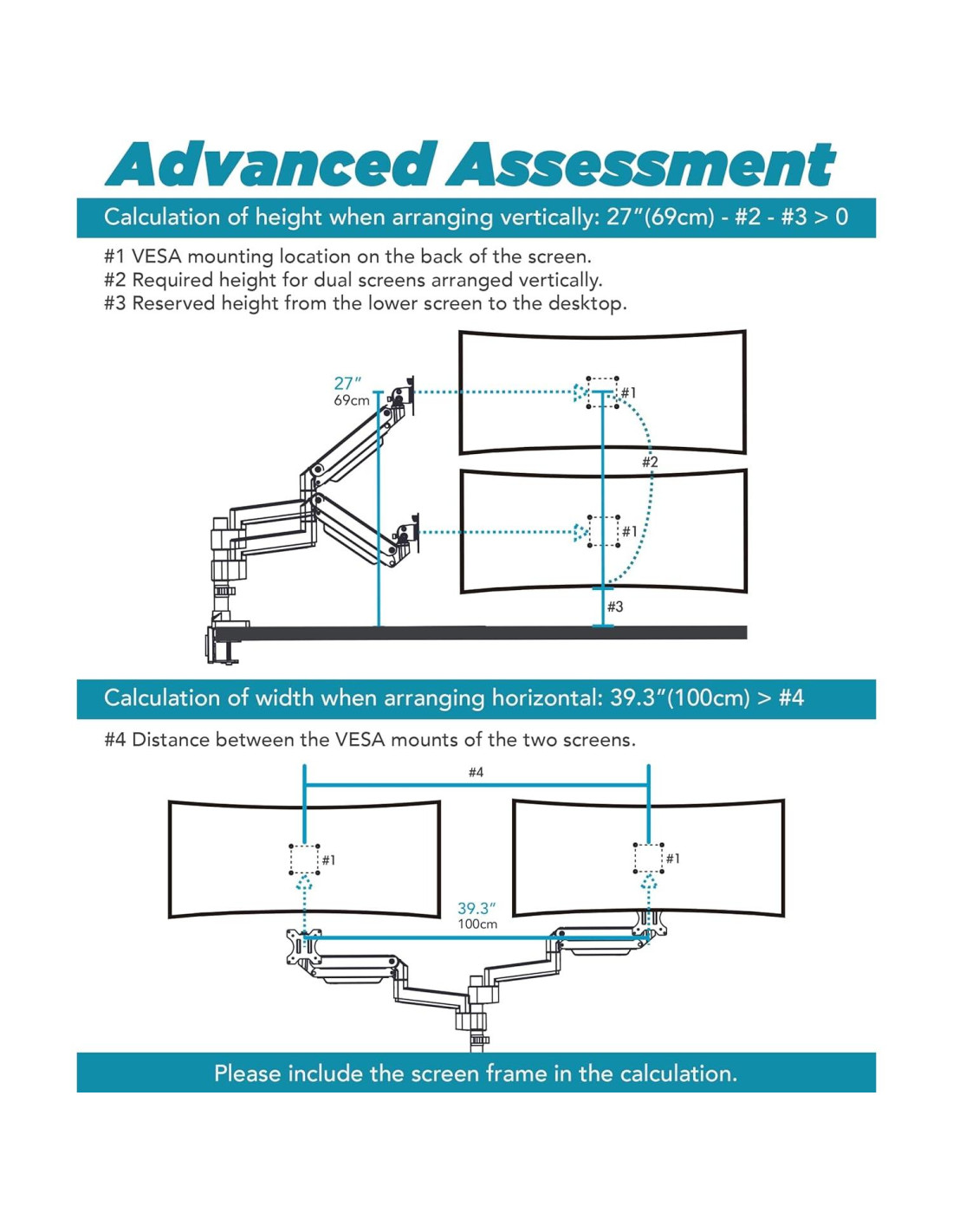 - Brazos de Extensión Modulares - La base con un poste extra alto tiene capacidad de montaje de 88 lbs (39,92 kg), que se puede actualizar a un montaje de monitor dual o triple. El montaje de monitor apilado dual se adapta a hasta dos monitores ultra anchos de 49". El soporte de monitor triple se adapta a dos monitores apilados y un monitor lateral.