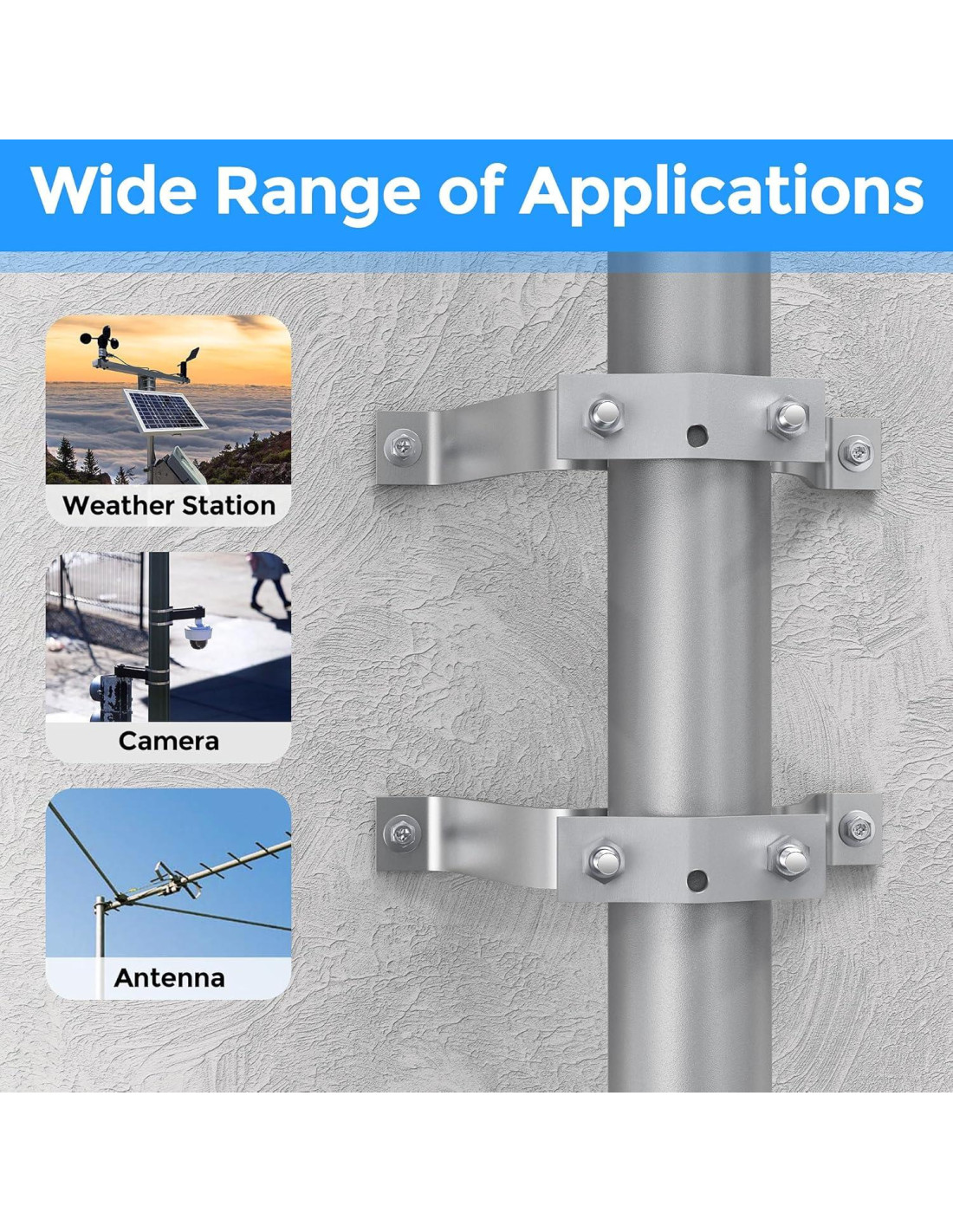 - Ampliamente utilizado: Los soportes de montaje de mástil de antena se pueden usar en paredes, chimeneas, debajo de aleros o techos. Donde sea que montes tu mástil, estos soportes de montaje de mástil harán el trabajo de instalar tu antena