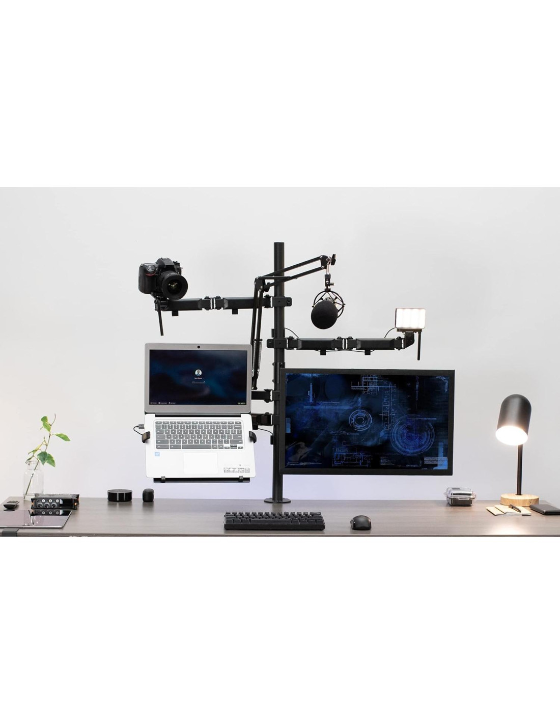Este soporte de estudio todo incluido tiene todo lo que necesitas para llevar tu transmisión en vivo al siguiente nivel. Dos brazos de dispositivo sólidos te dan flexibilidad en la configuración con la opción de montar monitores duales (hasta 32 pulgadas) o optar por una configuración de un solo monitor más laptop (hasta 15.6 pulgadas). Doble brazos de transmisión en vivo con manijas de posicionamiento de precisión ponen el control en tus manos con ajustes de inclinación, giro y rotación para una colocación perfecta de transmisión. Diseñado para sostener las herramientas que necesitas para tener éxito con bases de rosca de 1/4 pulgadas y 3/4 pulgadas, estos brazos de transmisión en vivo son ideales para cámaras DSLR, montajes para teléfonos celulares, luces de anillo y mucho más.
