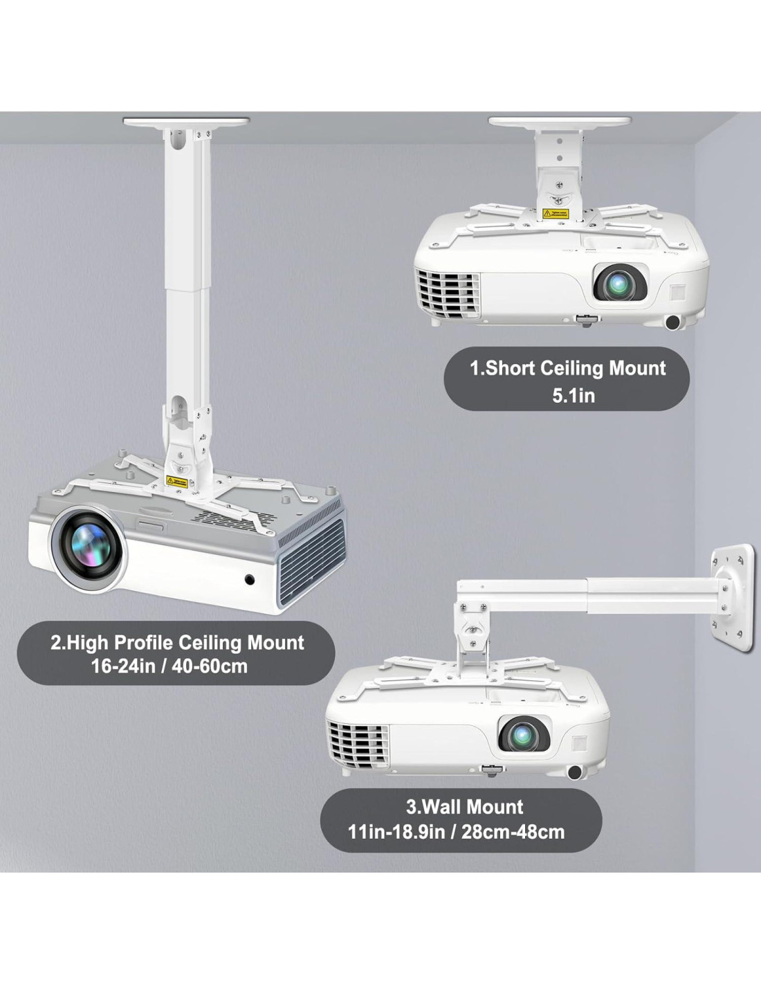 - Diseño Útil: el soporte para proyector sostiene proyectores a 40-60cm (16-24in) del techo. El recubrimiento de acero inoxidable blanco del soporte de techo para proyector es agradable para cines en casa, dormitorios, aulas, salas de conferencias y más. También es excelente como soporte de proyector al aire libre.