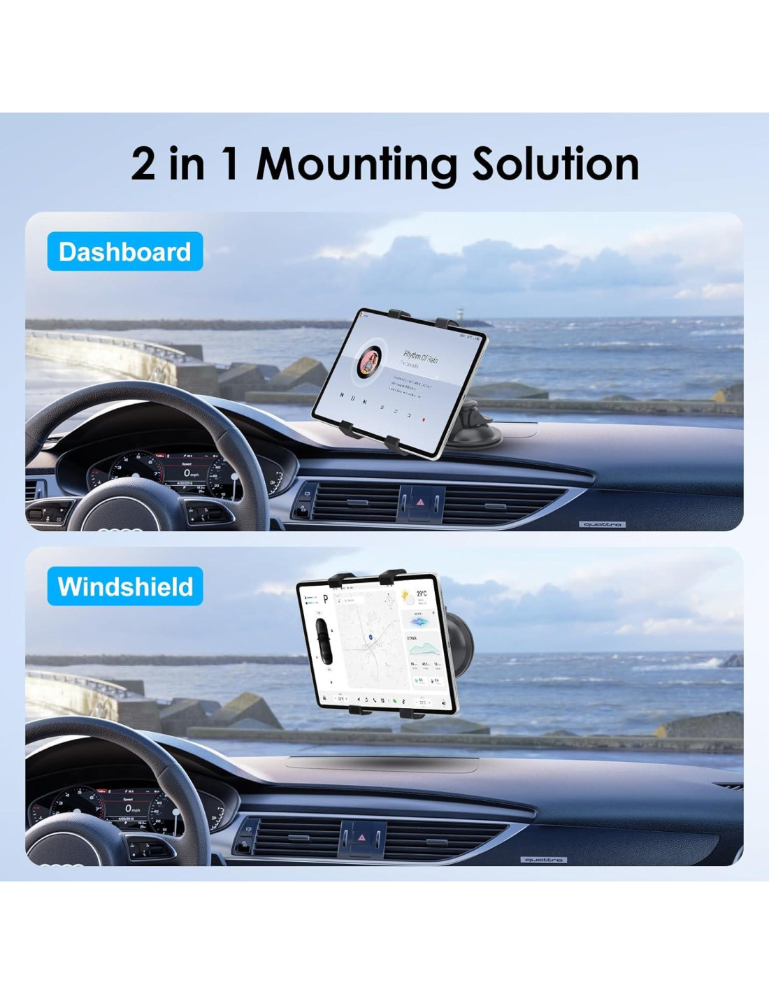 - Visualización en Múltiples Ángulos: Gracias a la bola giratoria de 360 y al brazo giratorio de 180, este soporte de tableta para tablero de coche puede satisfacer tu ángulo de visualización perfecto sin bloquear tu vista
