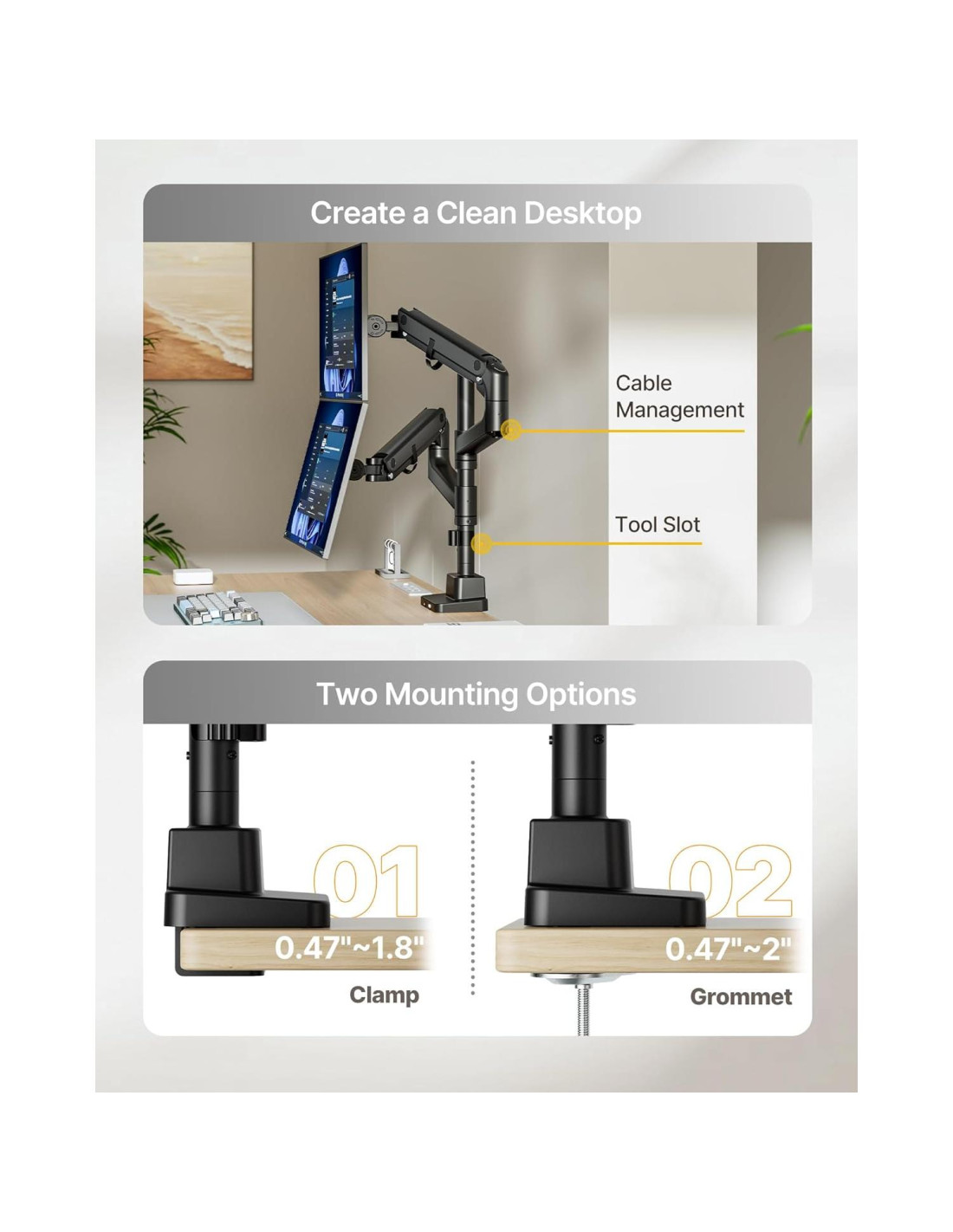 - Comodidad Ergonómica Encuentra la Máxima Flexibilidad. Diseñado para una experiencia de visualización superior, este soporte de monitor doble ofrece un rango de altura vertical extendido de hasta 29.4", con un poste de 19.2" que ayuda a reducir la tensión en el cuello y mejorar la postura al sentarse durante largas horas de trabajo o juego. El diseño de movimiento completo permite una inclinación de -75 a +75, un giro de +/-90 y una rotación de pantalla de +/-90, dándote control total para eliminar el deslumbramiento y encontrar el ángulo más cómodo para cualquier tarea. Ya sea que estés apilando dos monitores ultra-anchos para juegos inmersivos, programando con eficiencia de pantalla dividida, o revisando grandes conjuntos de datos lado a lado, este brazo se adapta a tu flujo de trabajo sin problemas.