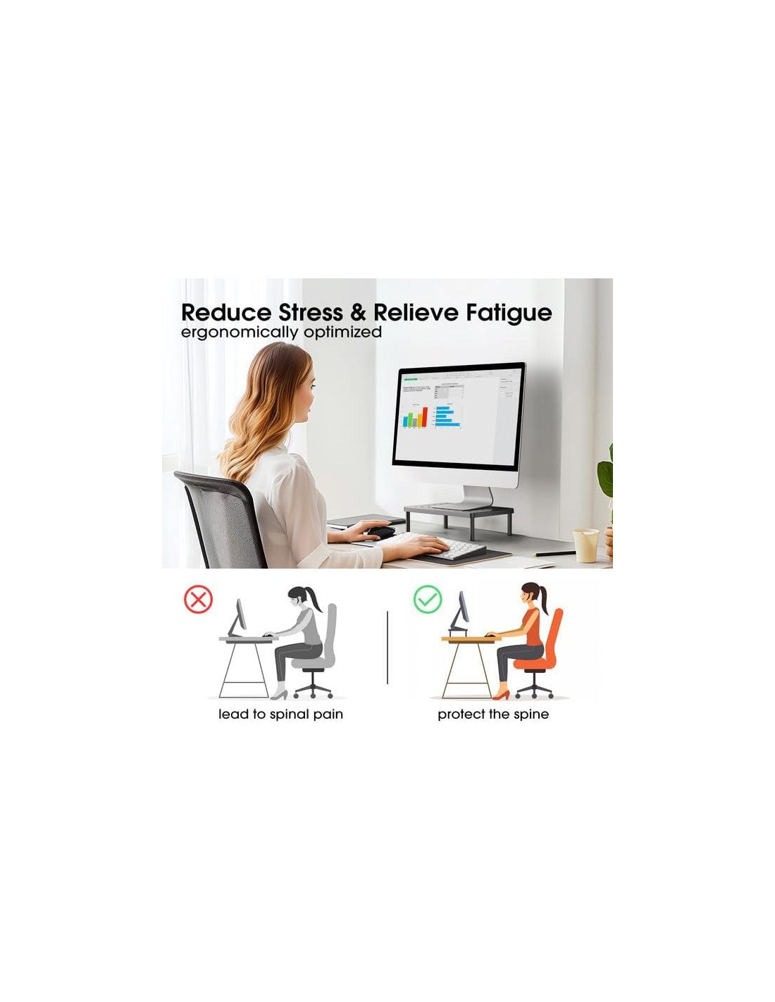 - DISEÑO REDUCTOR DE FATIGA: Este soporte para monitor de escritorio eleva tu pantalla para reducir la tensión en el cuello y los hombros, promoviendo una mejor postura durante largas horas de trabajo.