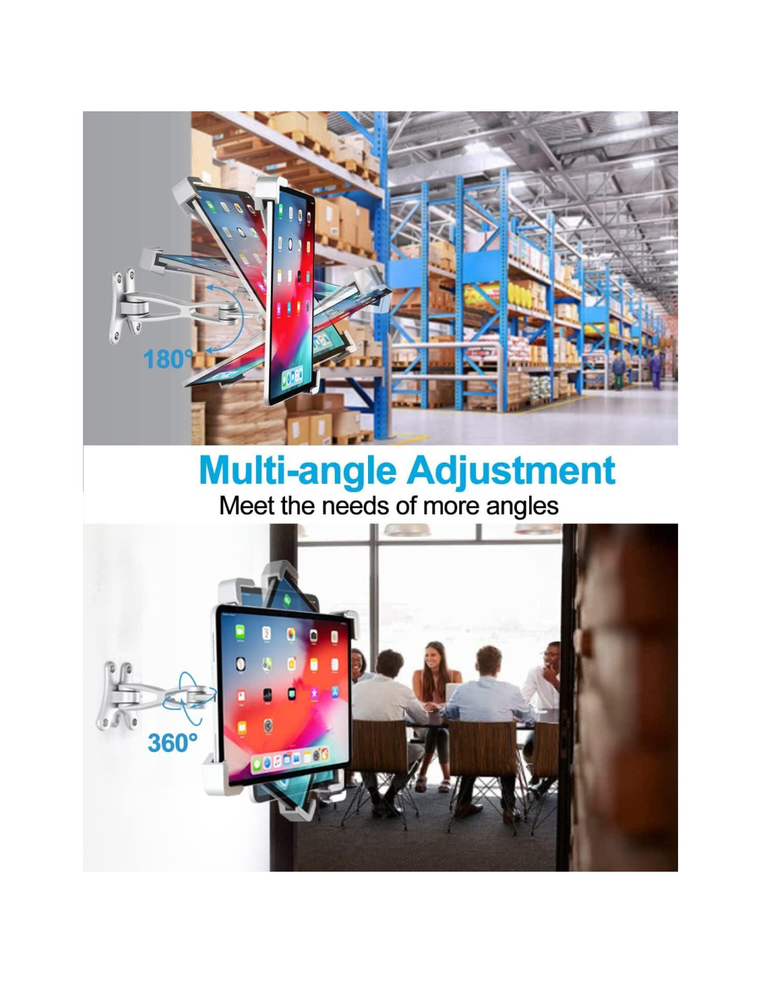 - [Ángulo múltiple ajustable] El soporte de pared para tabletas tiene tres juntas ajustables, de modo que los brazos se pueden ajustar hacia arriba y hacia abajo, izquierda y derecha, y los brazos se pueden plegar cuando no están en uso, lo que no afectará a las personas que pasan por la pared. Muy práctico y conveniente.