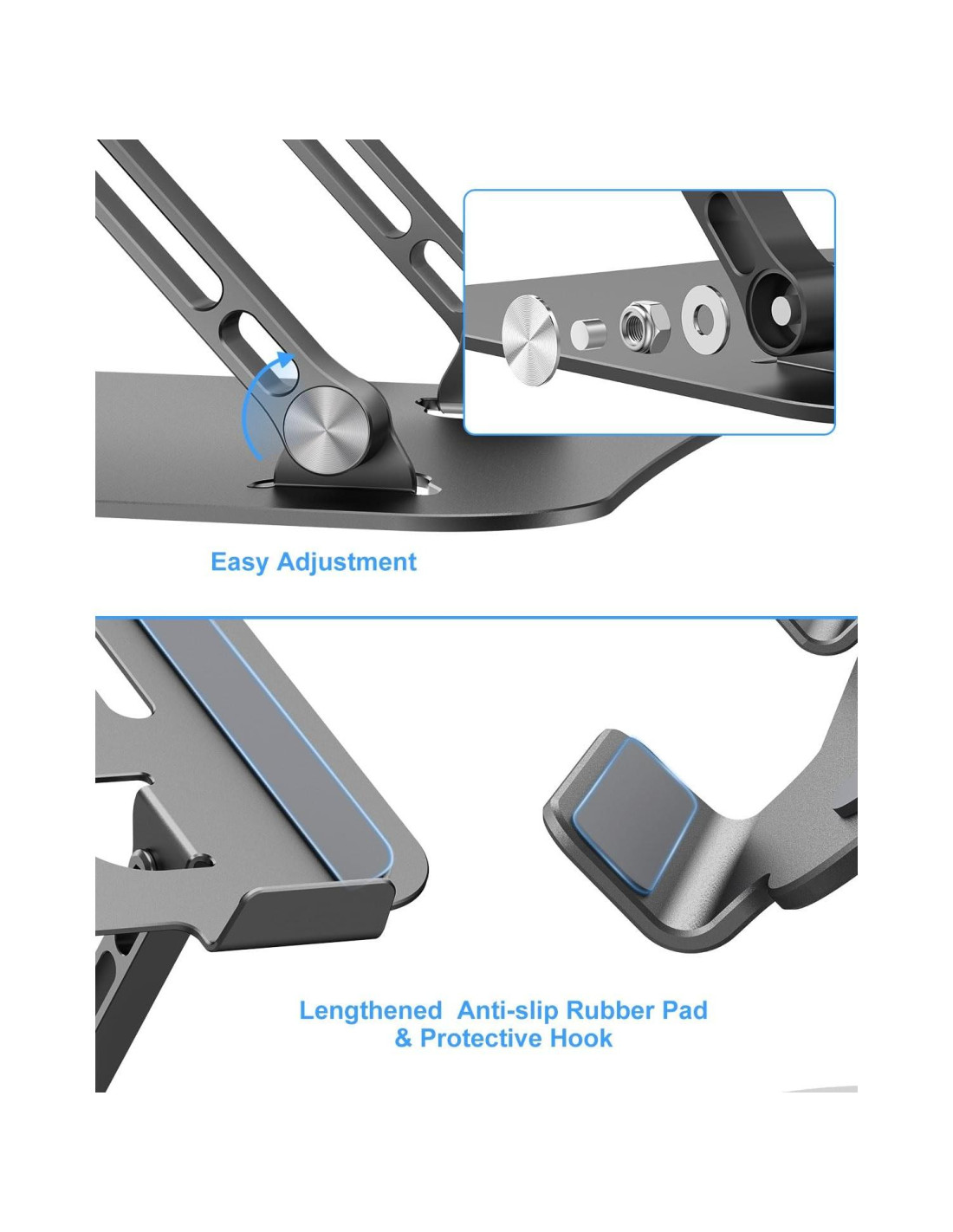 - Disipación de Calor: Los múltiples orificios de ventilación ofrecen una gran ventilación y ayudan al flujo de aire para enfriar tu laptop y prevenir el sobrecalentamiento. Además, el material de aleación de aluminio ayuda a absorber y difundir el calor mejor