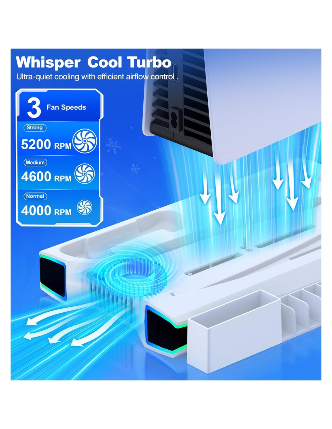 - Potencia de Enfriamiento Turbo: ¡Di adiós al sobrecalentamiento! Nuestro ventilador de enfriamiento turbo de 100W mejorado para ps5 aumenta la potencia de enfriamiento por 3x, con tres velocidades ajustables para mantener las cosas frescas durante tus maratones de juego más intensos. Además, la estación de enfriamiento ps5 recuerda tu velocidad de ventilador favorita, ¡como tu fiel compañero!