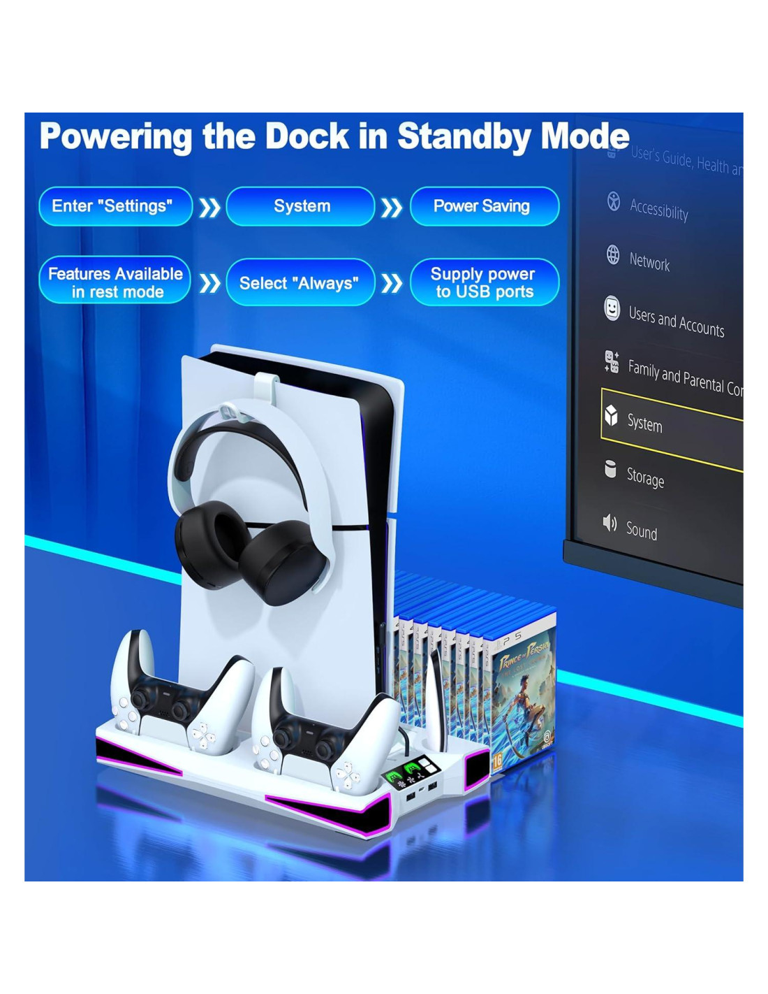 - Organiza Tu Equipo de Juego: ¡Mantén tu espacio de juego tan épico como tu jugabilidad! Nuestro muelle de enfriamiento y carga ps5 sostiene hasta 13 discos de juego, tus auriculares y el control remoto de PS5, todo mientras añade iluminación colorida y tres puertos de carga adicionales para tus dispositivos. ¡Di hola a una configuración ordenada y organizada!