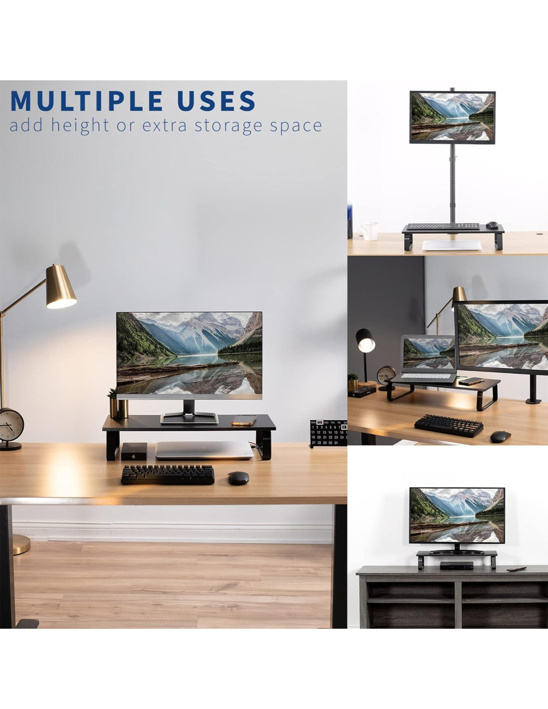 Este soporte mantiene su pantalla cómodamente elevada y cuenta con una variedad de usos. Además de sostener monitores de computadora (hasta 19.96 kg), se puede usar para elevar teclados, laptops e incluso pequeños televisores. La superficie de madera suave del soporte se integra bien en casi cualquier entorno. Dimensiones: 38.1 cm x 26.2 cm x 11.7 cm Colores: Negro, Blanco y Madera Clara Dimensiones: 60.4 cm x 26.2 cm x 11.7 cm Colores: Negro, Blanco y Madera Clara Dimensiones: 100.1 cm x 26.2 cm x 11.7 cm Colores: Negro, Blanco, Nogal Oscuro y Madera Clara Dimensiones: 139.7 cm x 26.2 cm x 11.7 cm Colores: Negro. Eleva fácilmente su monitor y otros dispositivos para una experiencia más cómoda. Elevar los monitores a una altura de visualización adecuada ayuda a prevenir la tensión en el cuello y la espalda, permitiéndole concentrarse en sus tareas.
