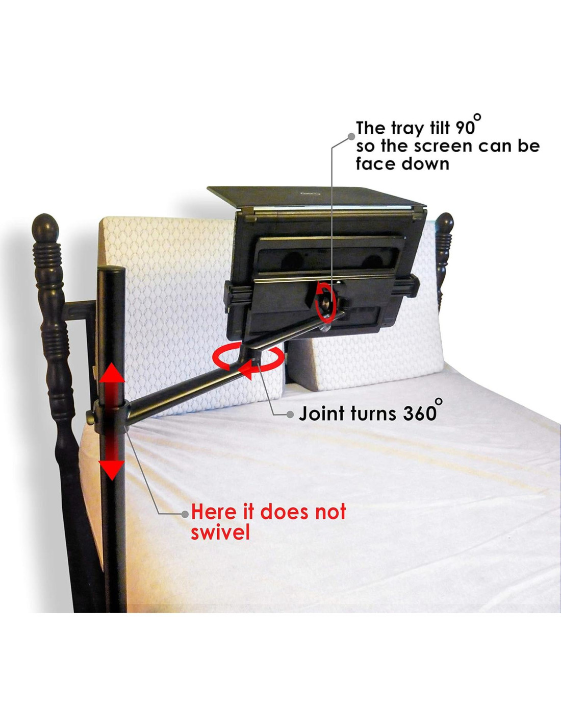 - La bandeja para Laptop/Tableta puede inclinarse 90 grados hacia arriba/abajo, por lo que puedes colocar la pantalla boca abajo para verla mientras estás acostado en la cama/sillón/reclinable