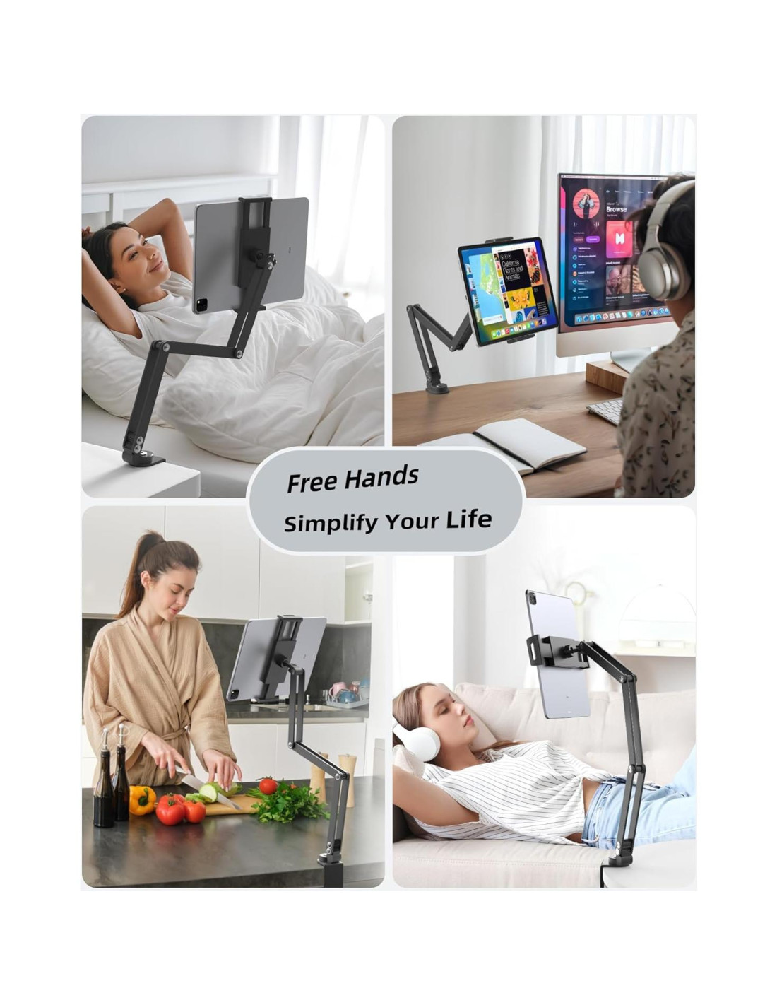 - Soporte de Brazo Ajustable de Múltiples Ángulos y Altura para iPad: Este versátil soporte de brazo para tableta de 5 juntas es completamente ajustable, ofreciendo rotación de 360 y flexión de 180 para el ángulo de visión perfecto. Con solo una mano, puedes ajustar fácilmente el brazo: simplemente empuja, tira y suelta para bloquearlo en la posición deseada. Altura total 58 cm (23 pulgadas), ya sea que estés de pie, sentado o acostado, este soporte para tableta proporciona la altura y el ángulo ideales para ver películas, jugar, leer o cocinar.