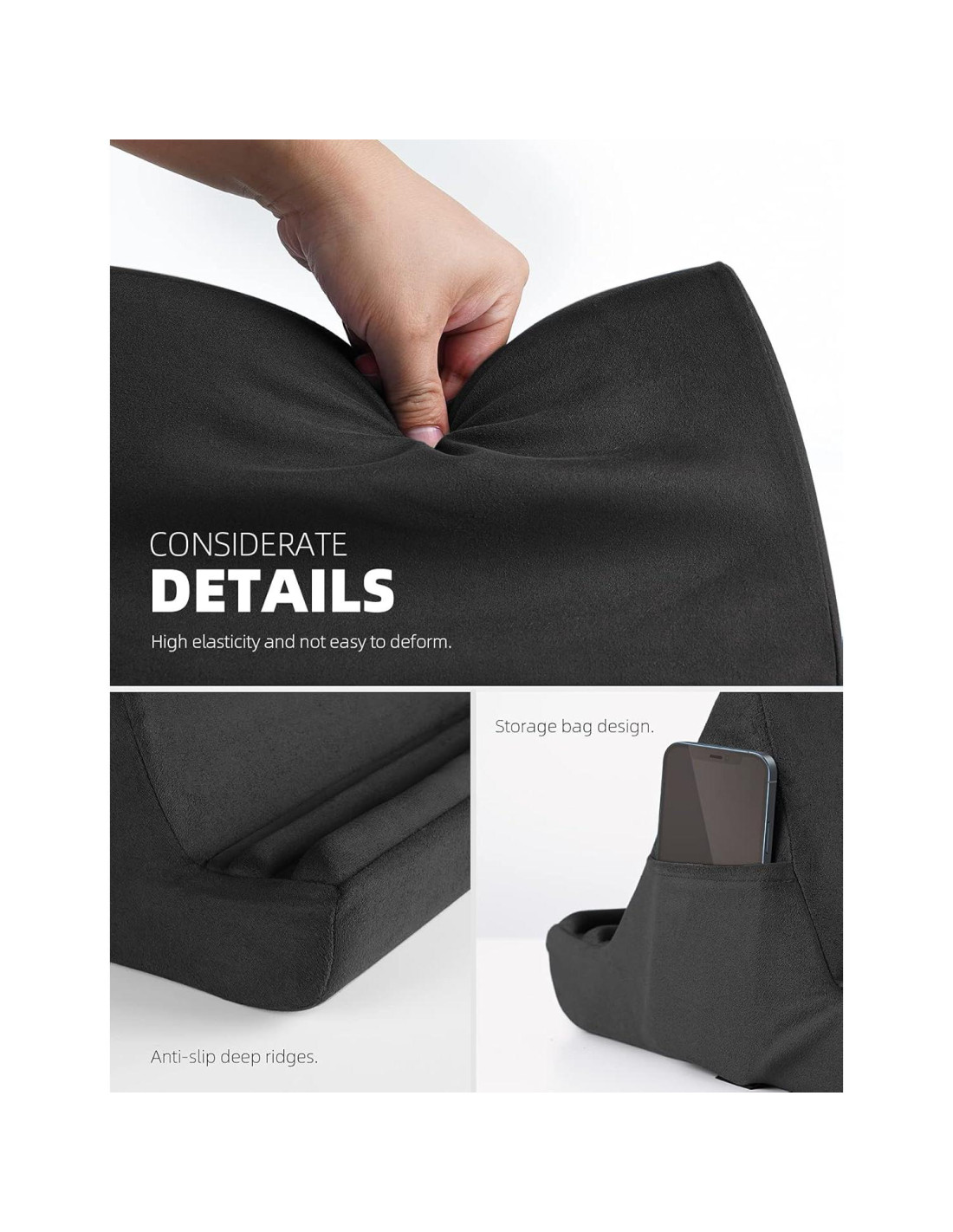 - [ Ranuras Más Amplias] Las ranuras más profundas y anchas pueden soportar tu tablet de manera más estable, evitando que la tablet se deslice. El bolsillo lateral te ayuda a colocar tu teléfono o lápiz de iPad, haciendo la vida más simple. Dado que la almohada está comprimida al vacío, colócala durante 6-24 horas después de recibirla para restaurar su forma normal o ponla en la secadora durante 20 minutos para inflarla.