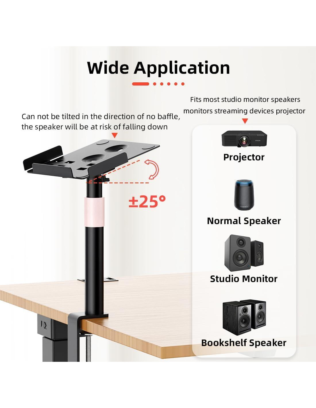 - [Ajuste de Ángulo] La inclinación de la bandeja del soporte de altavoz con abrazadera de escritorio se puede ajustar en cualquier lugar entre 25. Puede aflojar primero la perilla negra en forma de flor, luego mover la bandeja para ajustar el ángulo deseado, y finalmente apretar la perilla para asegurarla