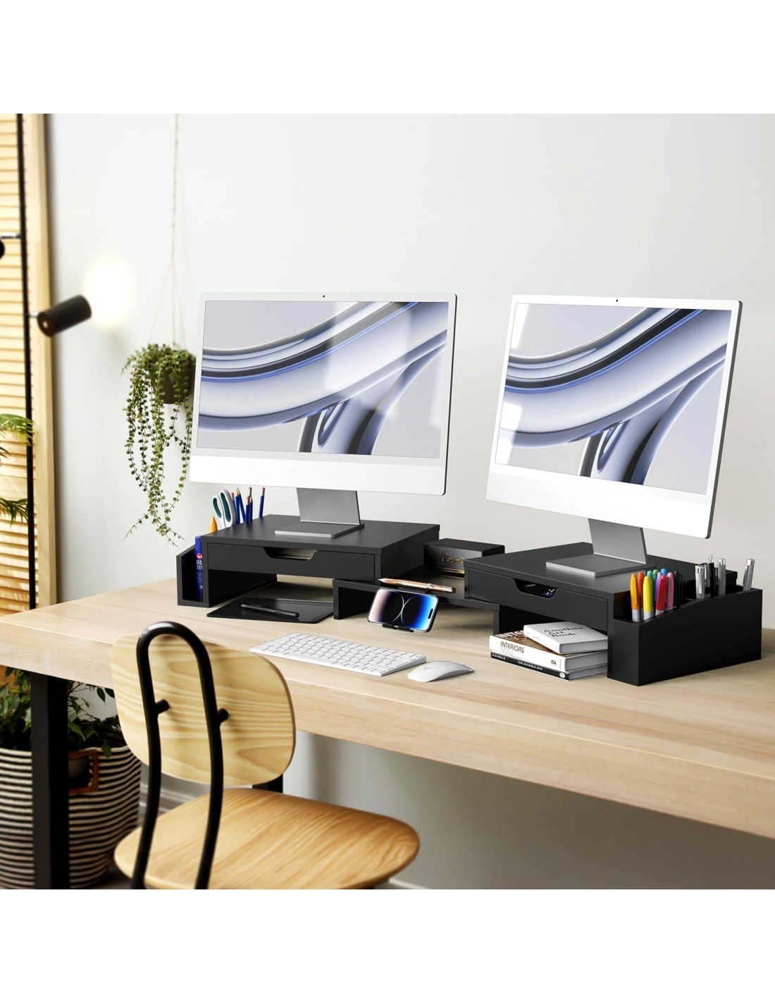 Diseñado con conveniencia y practicidad en mente, construido para ser el máximo ahorrador de espacio. Reduce la tensión en el cuello/la espalda al elevar tus monitores mientras organizas tus suministros de oficina. Soporte para teléfono y cajones deslizables incluidos para maximizar la utilidad de ahorro de espacio. Personaliza para crear una configuración de escritorio personalizada que funcione para ti. ¡Es la forma más simple! Cada lado es ajustable para convertirse en compacto, extendido o en ángulo. Personaliza al ángulo perfecto que se ajuste a tu configuración de escritorio. El accesorio de soporte removible crea una opción adicional para colocar un teléfono o tableta para una fácil visualización. Los bolígrafos o lápices también se pueden colocar aquí. Un cajón tiene compartimentos dedicados para sostener bolígrafos, lápices, notas adhesivas y otros suministros. El otro tiene espacio abierto para colocar todo lo demás. Los compartimentos izquierdo y derecho ofrecen aún más opciones para colocar suministros de oficina, ¡haciendo de esto el ahorrador de espacio óptimo! Configuración de monitor único, utiliza menos espacio para espacios de escritorio más pequeños. Configuración de monitor doble, cubre más área para optimizar aún más el espacio del escritorio. Configuración de monitor doble, excelente para crear una alternativa de monitor curvo ultrawide. El soporte para monitor puede ayudar a elevar tu monitor a una altura cómoda para un mejor ángulo y posición de visualización. Esta elevación te ayuda a lograr la posición de visualización a nivel de los ojos perfecta para deshacerte del dolor de cuello / espalda debido a ángulos de visualización incorrectos. Doble / 2 Cajones Doble / 1 Cajón Malla / Único / 1 Cajón Madera / 1 Cajón Único / 1 Cajón