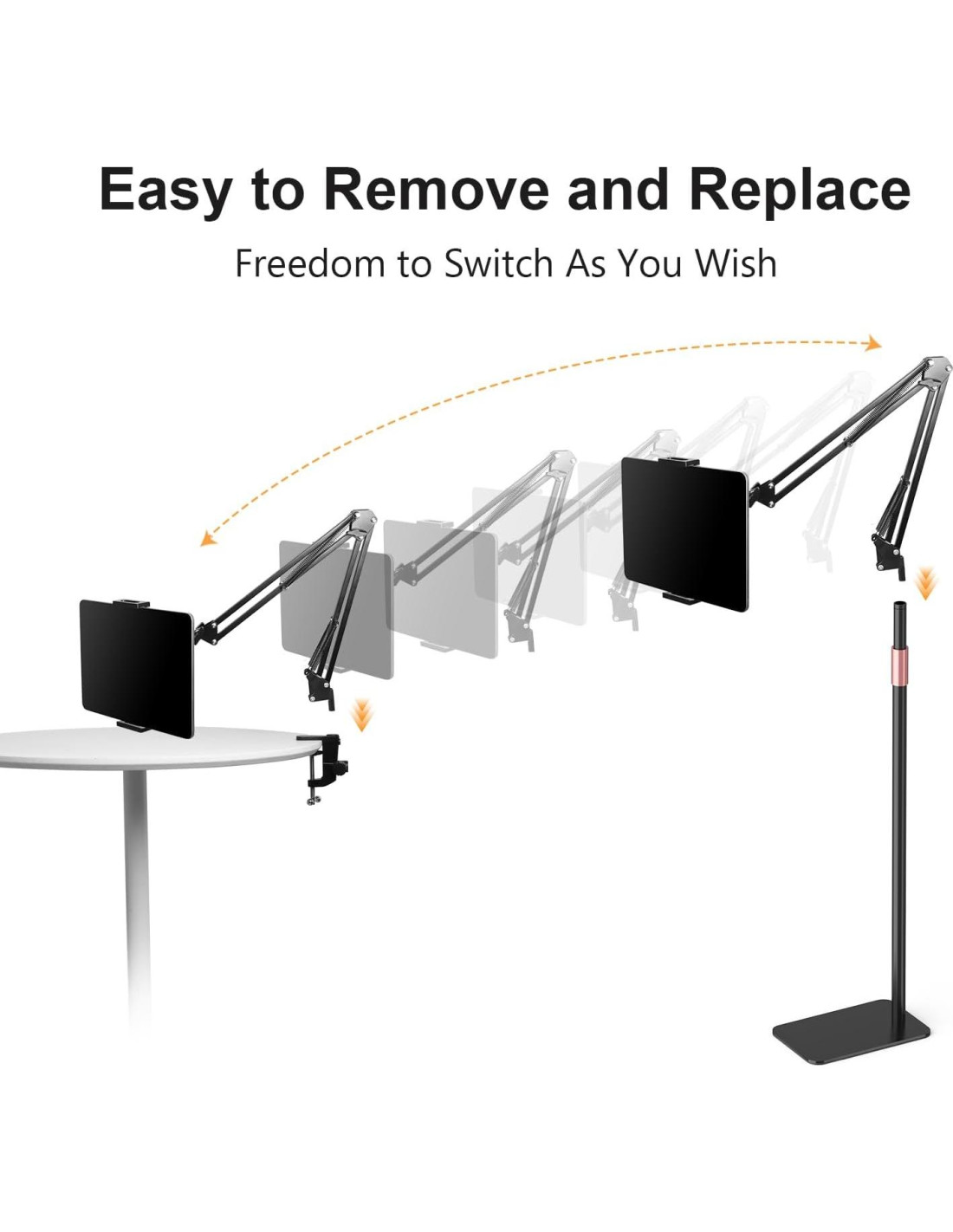 - Estructura Estable y Base Robusta: El brazo de la estructura del soporte para iPad está equipado con un diseño de resorte y perilla, que resuelve el problema de caída fácil de productos similares; y la base del soporte para tableta de escritorio está hecha de aleación de aluminio, que es más fuerte que la base de plástico y no es fácil de romper.