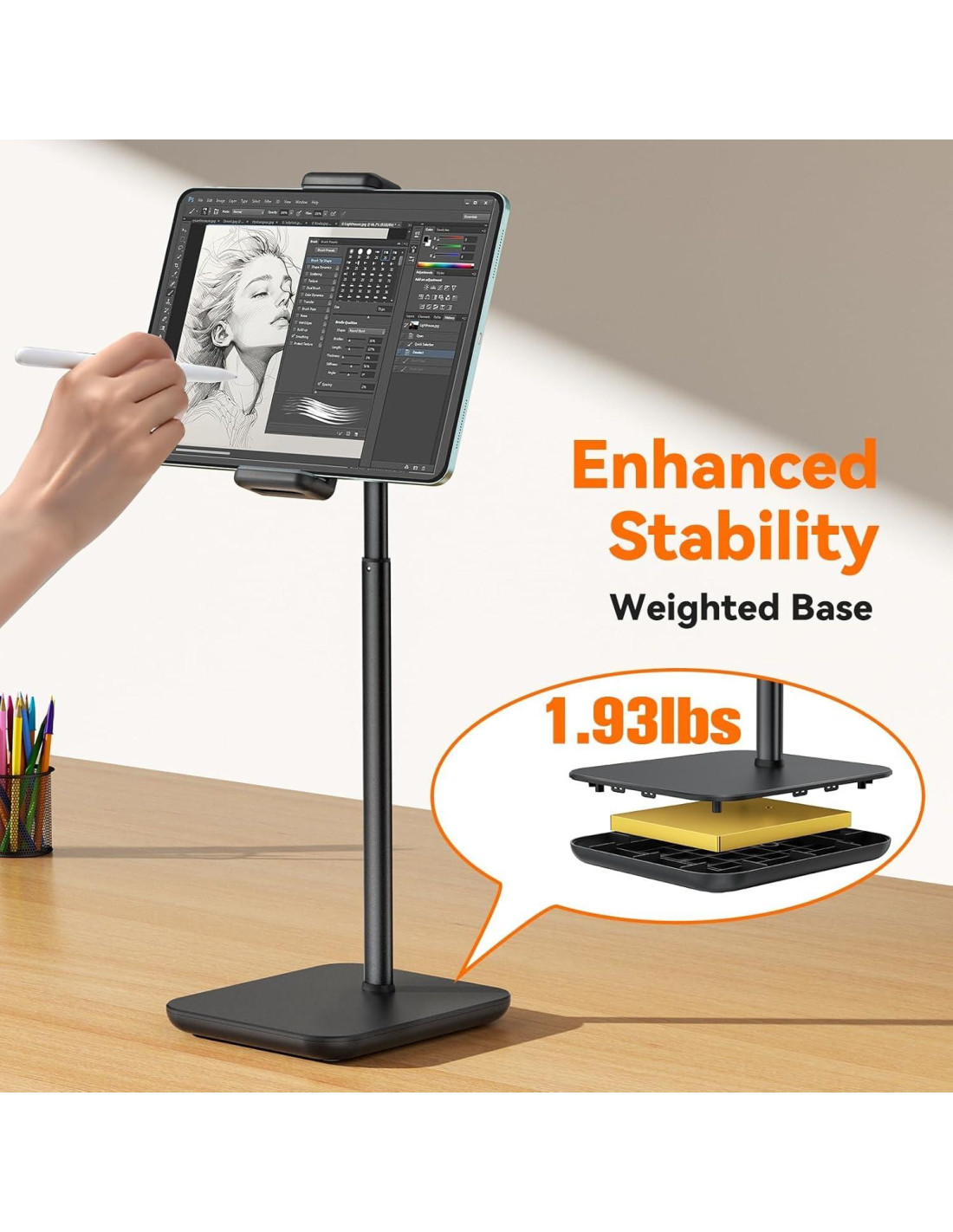 - Fuerte y Duradero: El soporte para iPad está construido con materiales de alta calidad y recientes mejoras en el pivote para mayor durabilidad. Pesa aproximadamente 2.2 lbs (0,99 kg) y tiene almohadillas de goma en el soporte y la base para estabilidad y para evitar que tu dispositivo se resbale o se raye.