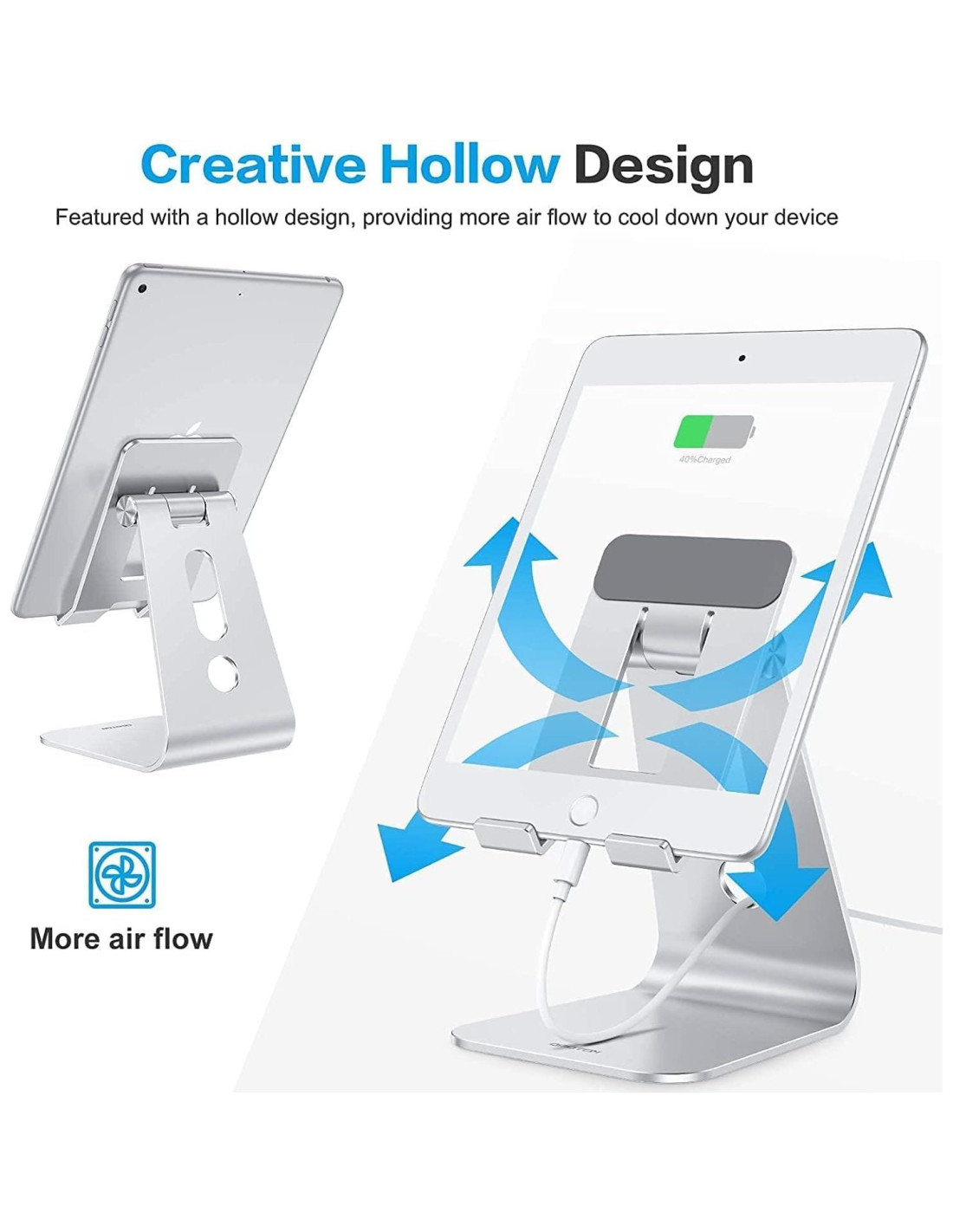 - DISEÑO PRÁCTICO: Con un diseño hueco creativo, este soporte para tabletas permite un mayor flujo de aire para ayudar a enfriar los dispositivos. Los brazos más largos también permiten que el soporte para tabletas sostenga su dispositivo incluso con una funda gruesa.