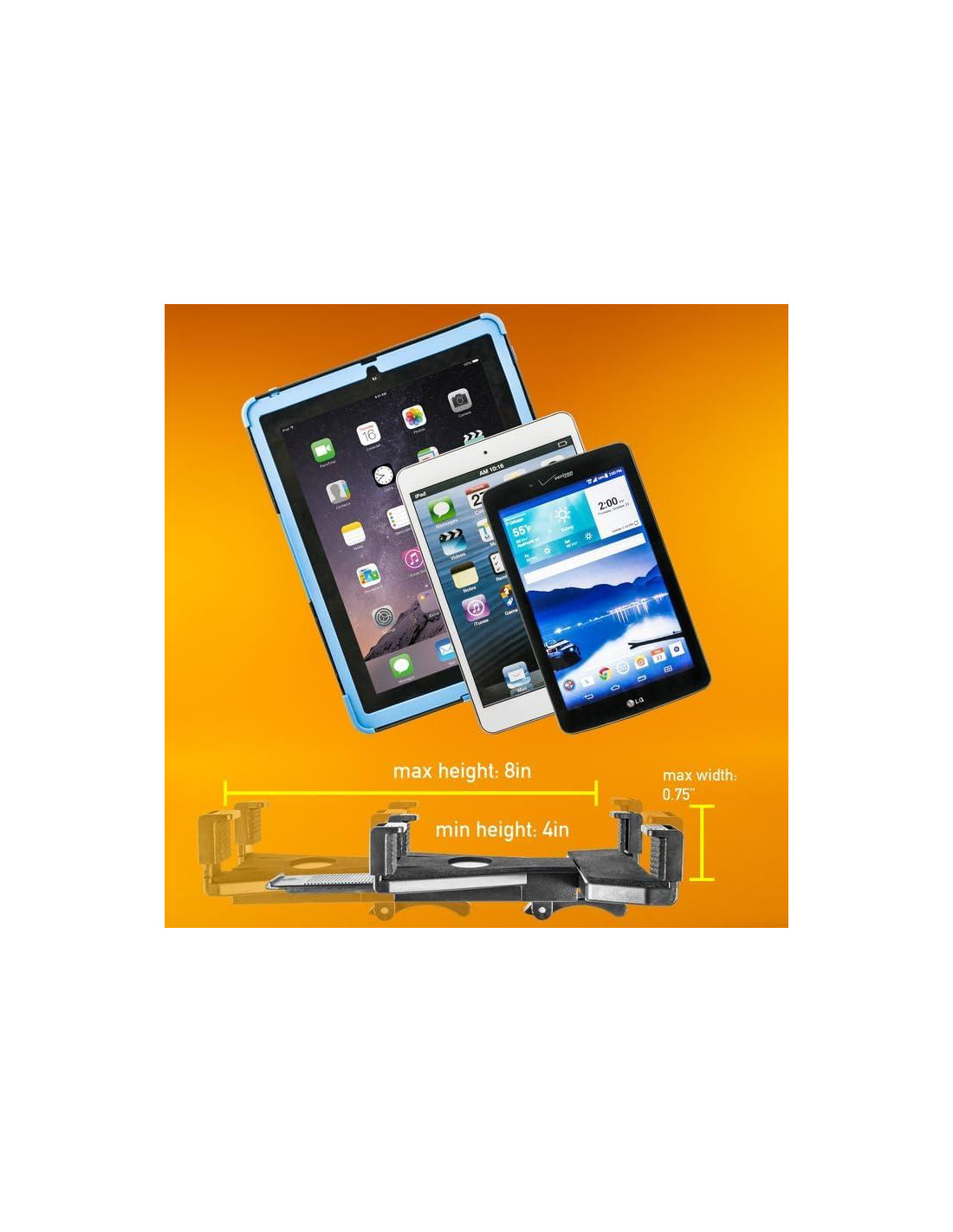 - DISEÑO UNIVERSAL - se adapta a todas las Tablets de 7"-10". (iPad, Nexus, Sony Xperia, Kindle, Samsung Galaxy Tab). Este kit incluye: soporte para tablet TadDock, pedestal ajustable de 8" con múltiples ángulos, paquete de tornillos y adhesivo para la base de perforación.