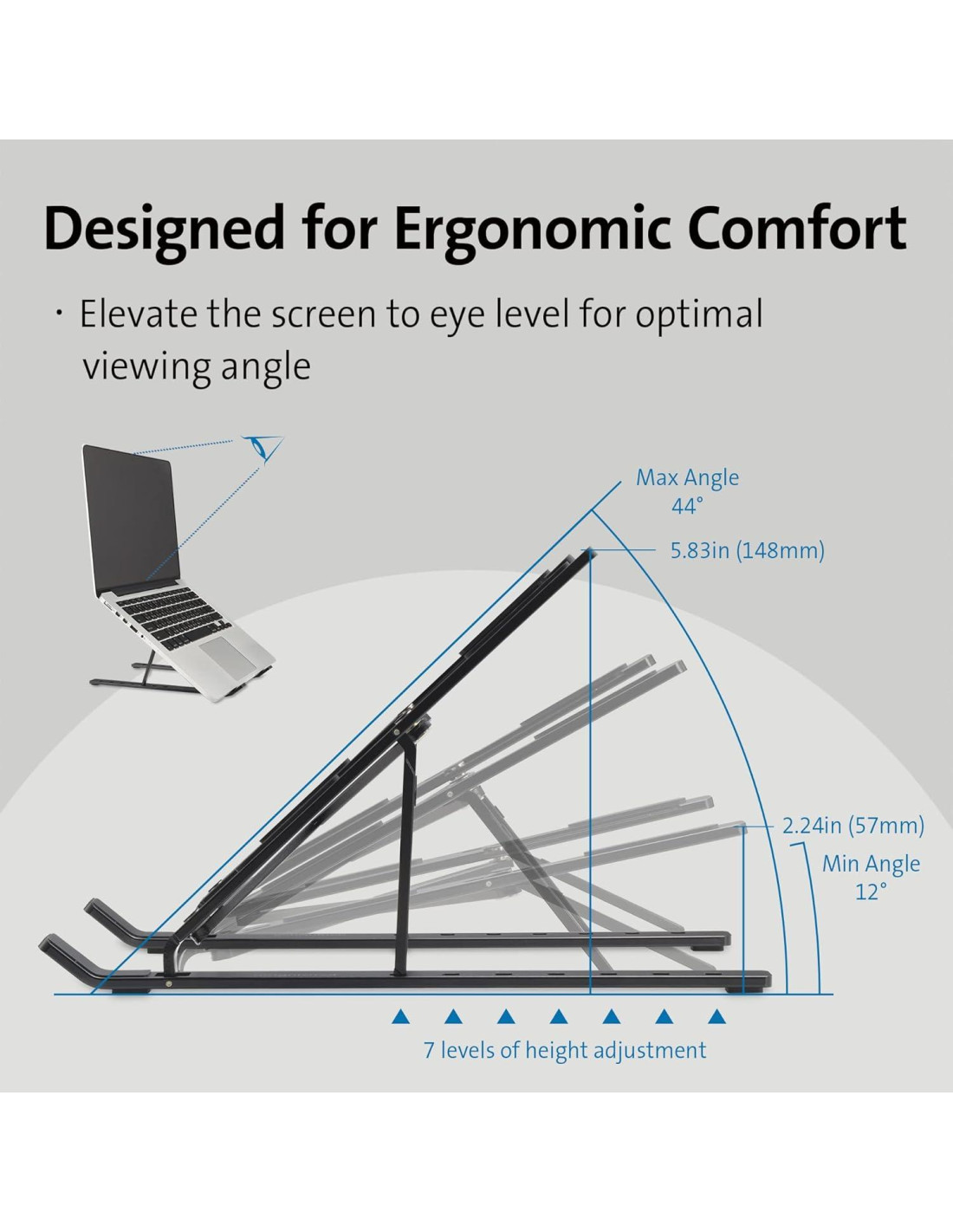 - Proporciona 7 niveles de ajuste de altura/ángulo para una visualización óptima. La altura se ajusta de 2.24" (5,08 cm) a 5.83" (14,76 cm); el ángulo se ajusta de 12 a 44