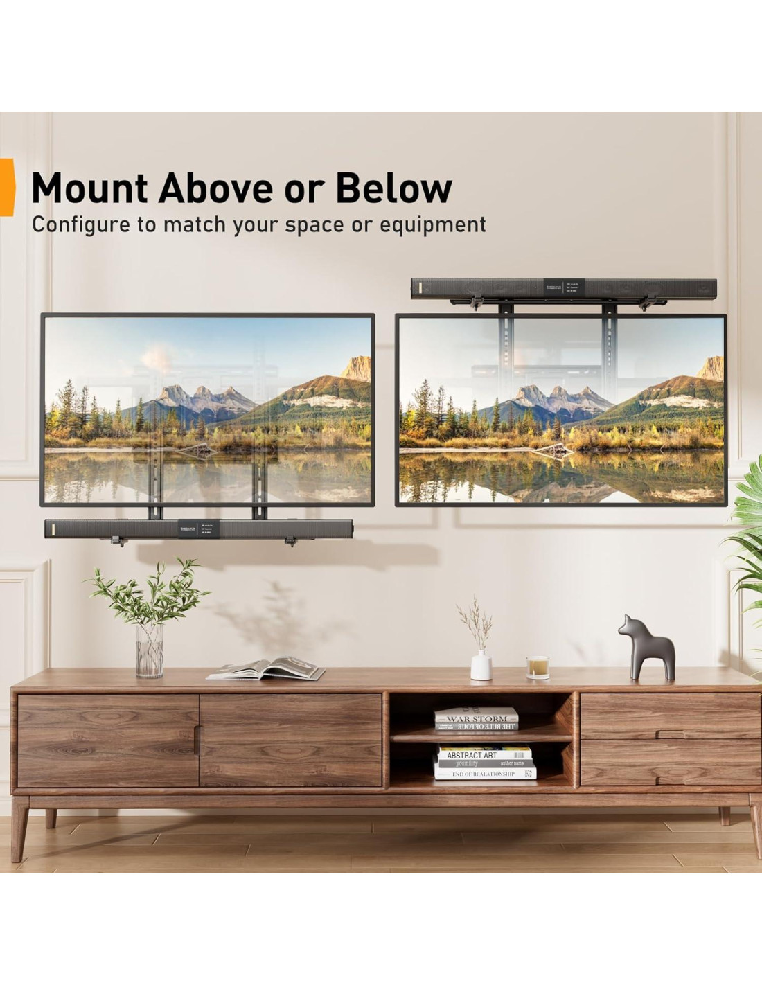 - Soporte Flexible: El soporte de base ajustable se extiende 6" (15.2 cm) y se retrae a 3.5" (8.9 cm) para adaptarse a diferentes anchos de barras de sonido. El soporte de barra de sonido te permite posicionar tu barra de sonido por encima o por debajo de tu pantalla para una colocación óptima del sonido.