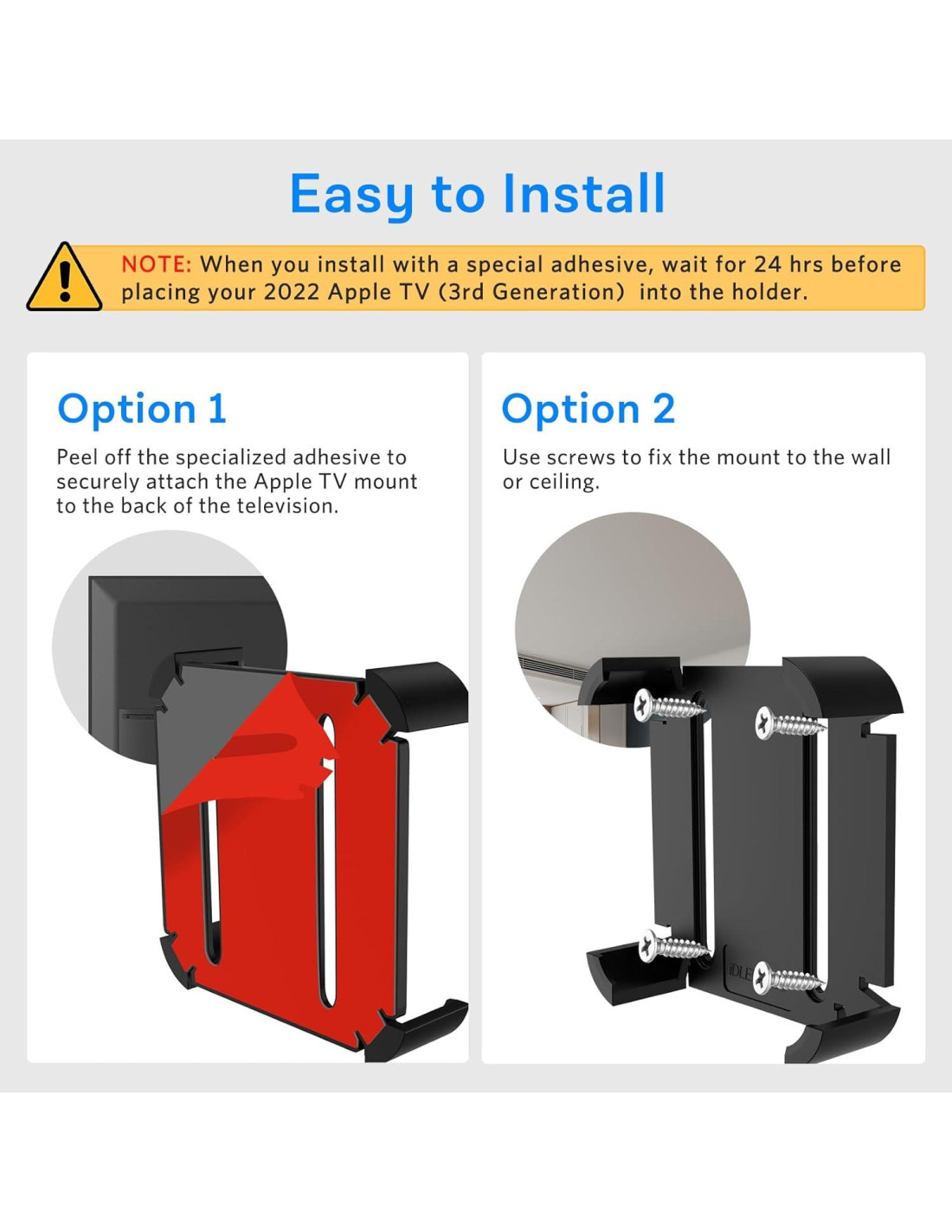 - Fácil de Instalar: Tienes la opción de fijar de forma segura el soporte para Apple TV detrás de la TV despegando el adhesivo especial y esperar 24 horas antes de colocar tu Apple TV 2022 (3ra Generación) en el soporte o usar tornillos para fijar el soporte a la pared o al techo. Esto ahorra espacio, mejora la estabilidad y elimina preocupaciones sobre que el Apple TV se caiga