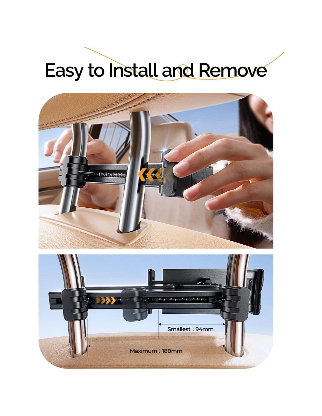 - [Construcción Premium] : El soporte para tableta en reposacabezas de coche para niños está fabricado con varillas de reposacabezas de acero refinado de primera calidad. Los clips de la varilla del reposacabezas cuentan con una estructura triangular optimizada, evitando roturas en las juntas debido a la fuerza, haciéndolo más duradero en comparación con soportes de tableta similares. Los ganchos profundos y las almohadillas de goma antideslizantes protegen tu iPad, proporcionando una estabilidad excepcional incluso en caminos difíciles. Es un excelente accesorio imprescindible para viajes largos.