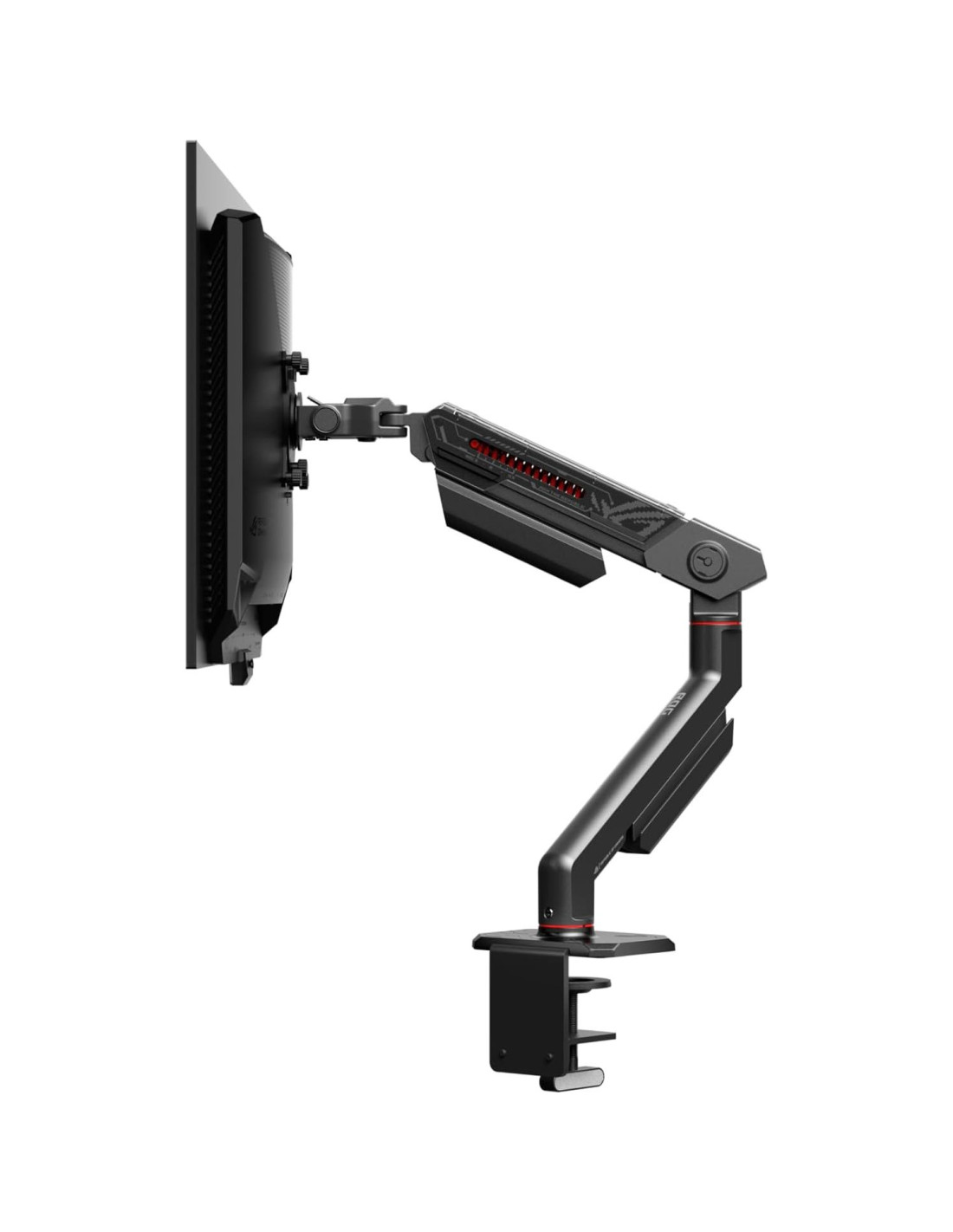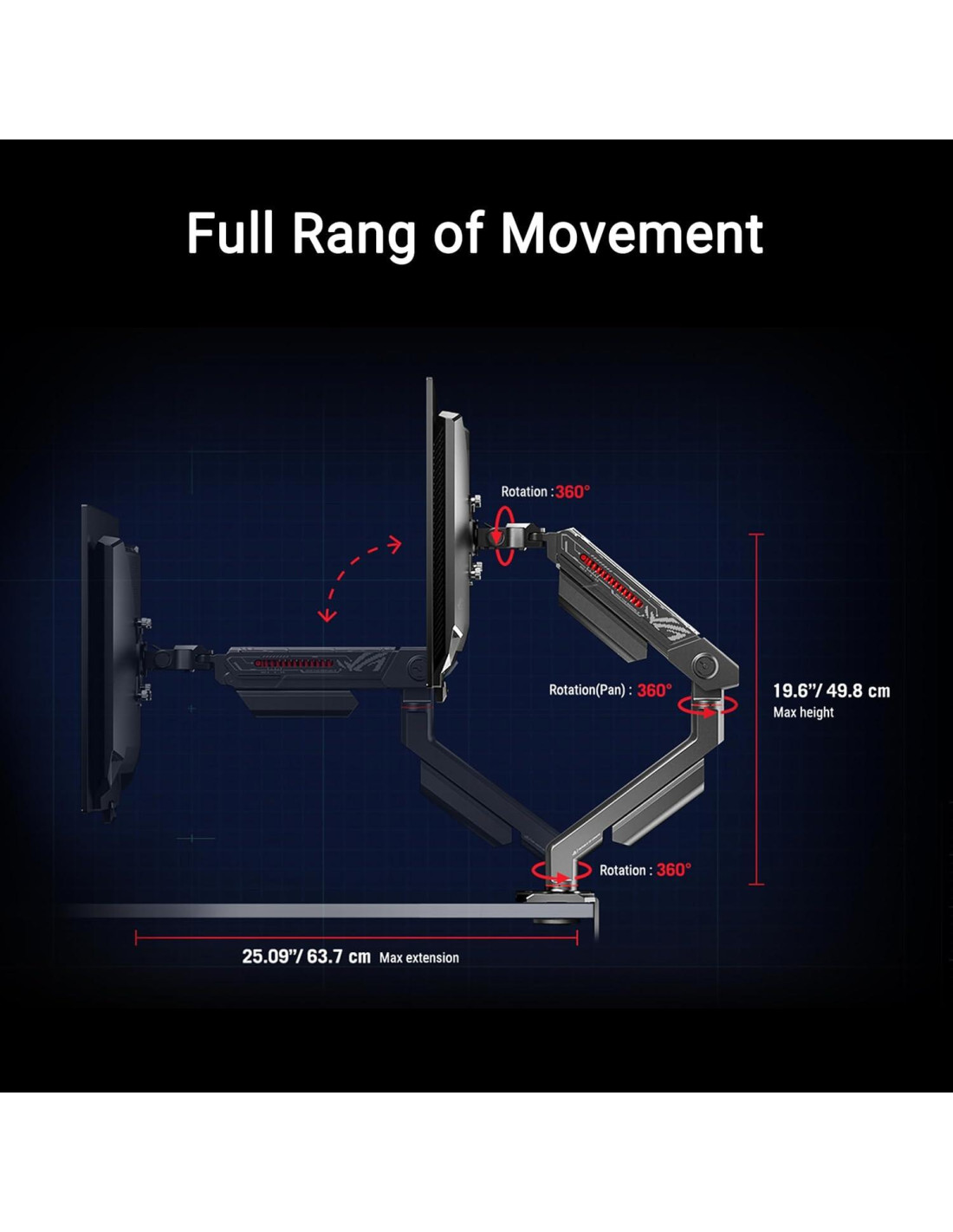 El soporte de monitor ROG Ergo está diseñado para ser compatible con una amplia gama de monitores. Puede manejar monitores de hasta 99 cm (39 pulgadas), soportando monitores planos con un peso máximo de 10.58 kg (23.35 lbs) o monitores curvos que pesen hasta 8.5 kg (18.74 lbs). El sistema de resorte mecánico del soporte de monitor ROG Ergo permite ajustes suaves y sin esfuerzo a través de una amplia gama de movimientos. Inclina, gira o pivota el monitor a la posición deseada.