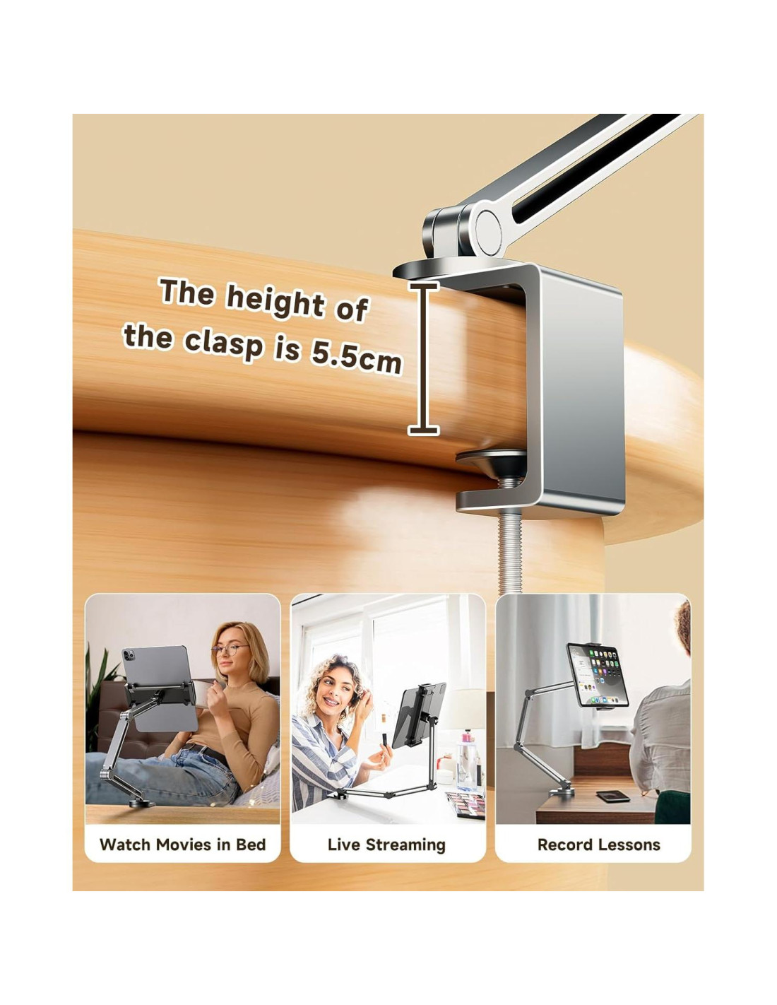 - Brazo Largo de 3 Secciones y Rotación de 360 para Máxima Flexibilidad: Diseñado para escritorios, encimeras y uso en la cama, este soporte de brazo para tableta cuenta con un brazo ajustable de tres secciones y una base rotativa de 360, permitiéndote posicionar tu pantalla a la altura y ángulo perfectos. Ya sea que estés viendo películas manos libres en la cama, siguiendo una receta en la cocina o trabajando cómodamente en tu escritorio, este soporte de mesa se adapta sin esfuerzo a tus necesidades.