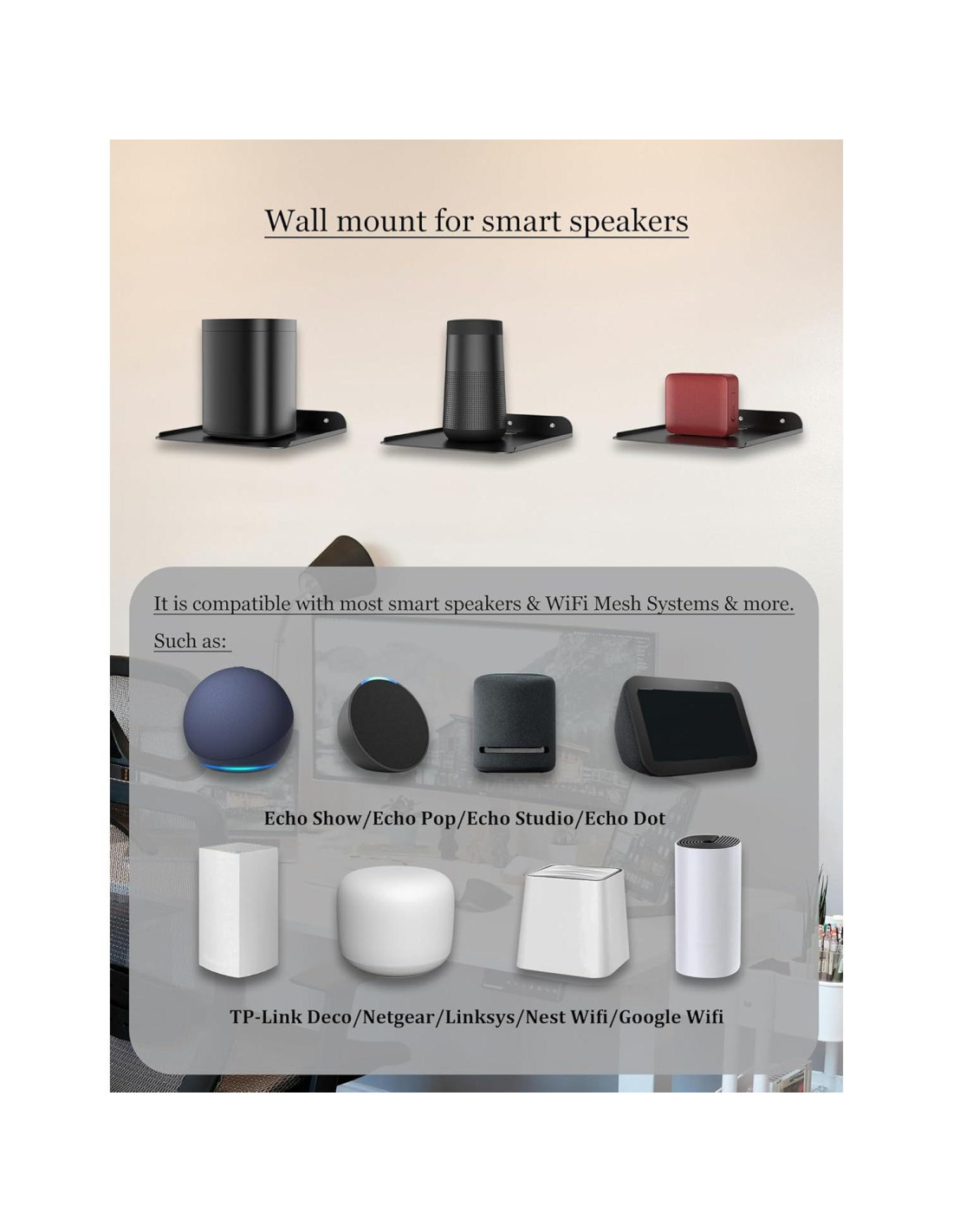 - Estante para Altavoces Montado en Pared: Los estantes flotantes para pared son compatibles con la mayoría de los altavoces inteligentes, como Echo4/5, Echo show5/8/10, Echo Studio/Pop/Sub/Plus, Sonos, Homepod2/mini. También es adecuado para altavoces Bluetooth, como JBL, Bose y más.