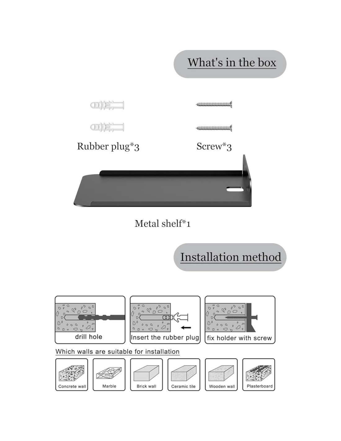 - Qué hay en la Caja: 1* Estante de pared, 3* Tornillo, 3* Tapón de goma.