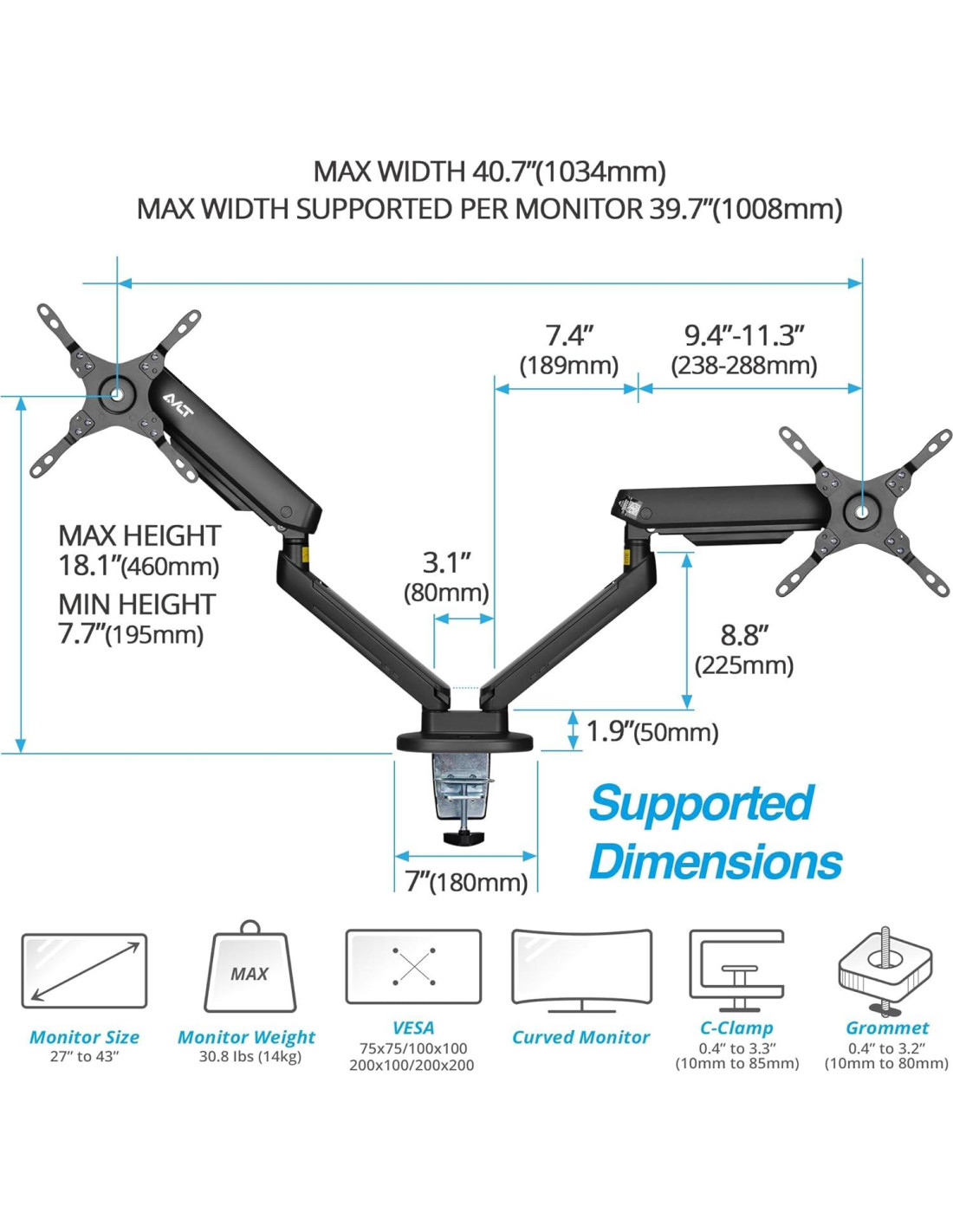 - Amplia Compatibilidad: Se adapta a pantallas de 27 a 43 pulgadas; Soporta monitores planos, curvos y ultrawide que pesan de 11 a 30.8 lbs (5 a 14 kg); Patrones de montaje VESA de 75x75 mm, 100x100 mm, 200x100 mm, o 200x200 mm.