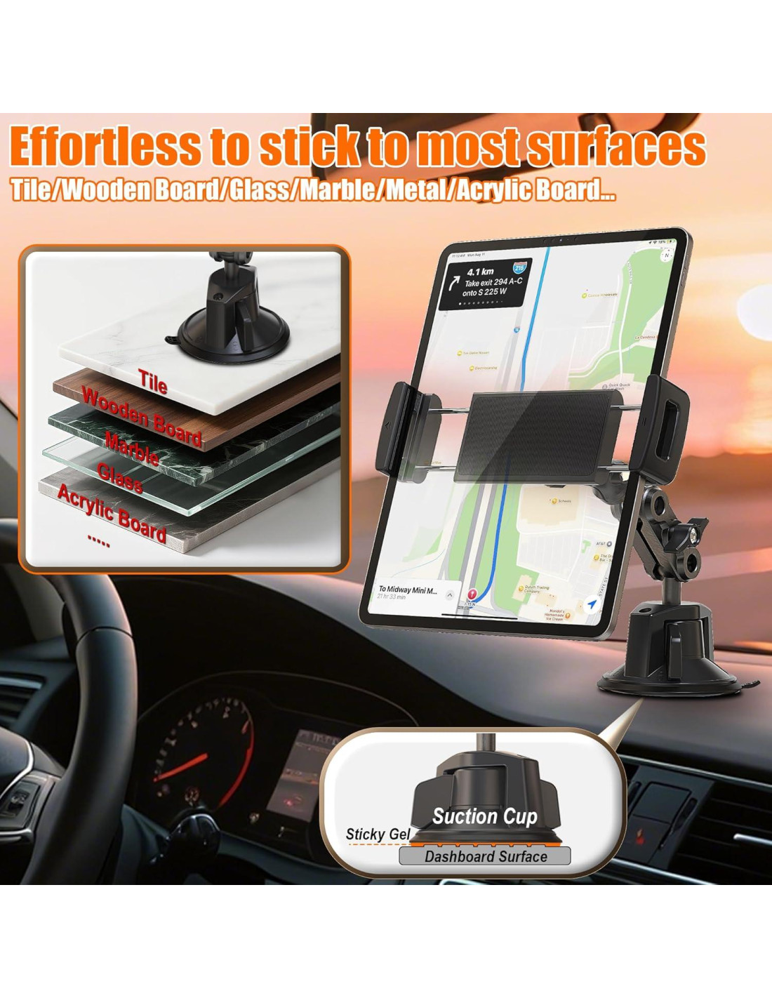 - Soporte para Tablet de Alta Resistencia: Este soporte para tabletas de coche viene con una ventosa ultra fuerte que se adhiere a cualquier superficie lisa y plana fácilmente: parabrisas, tableros elegantes, escritorios, paredes, espejos. Se adapta a coches, camiones, semirremolques, furgonetas comerciales y más. Como un soporte confiable para tabletas para camiones, su brazo mágico de metal se ajusta sin esfuerzo mientras se mantiene firme, manteniendo tu teléfono o tablet estable incluso en caminos irregulares.