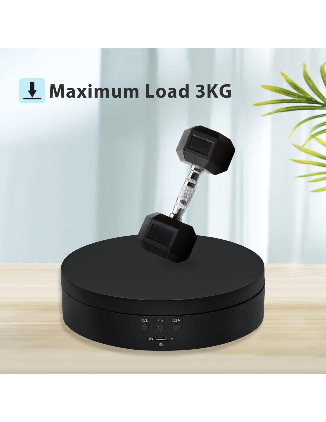 - Puede controlar la velocidad y ajustar la dirección o el ángulo. R,L: cambiar a sentido horario o antihorario; SR: regulación de velocidad, 2r,4r,6r por minuto; ASA: regulación de ángulo, 45 grados, 90 grados, 180 grados, circulación de 360 grados. La capacidad de carga es de aproximadamente 3kg (depende de la velocidad seleccionada).