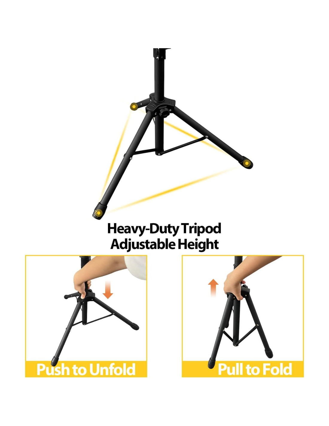 - Tira del conjunto del trípode hacia arriba para desplegar el trípode, empuja el conjunto hacia abajo para plegar el trípode, fácil de montar o desmontar para almacenar/transportar. O simplemente puedes inclinar la bandeja verticalmente para guardar el trípode en la esquina o en el armario.
