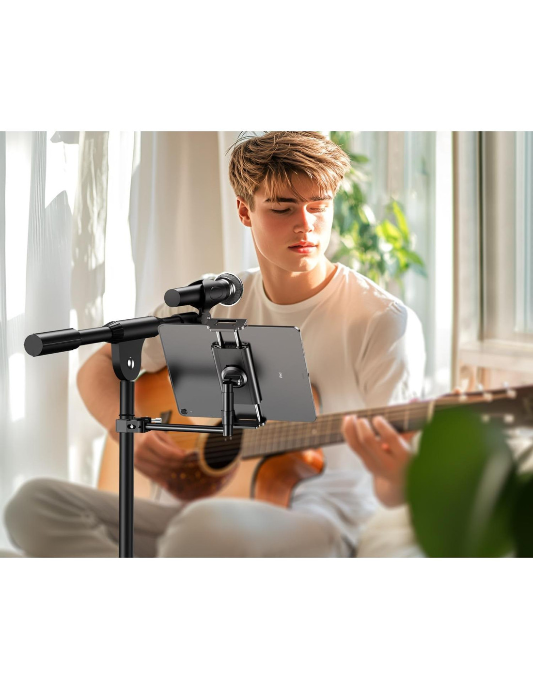 - [Diseño para soporte de micrófono] Este soporte de iPad para micrófono está construido en un 99% de metal de aluminio resistente, compatible con todos los iPad y teléfonos celulares de 4.7-13 pulgadas. Permite un fácil montaje y posicionamiento de tu iPad en cualquier posición y ángulo del soporte de micrófono, brazo, soporte de música, soporte para platillos. Úsalo al tocar y compartir música en clase de coro, bodas, conciertos, fiestas, reuniones.