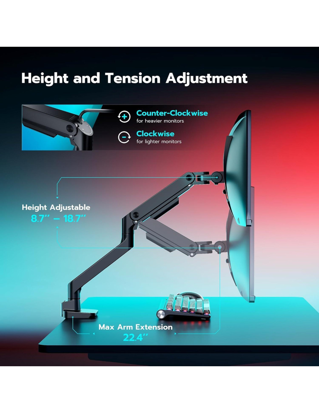 - Rango completo de movimiento. Este brazo de montaje de escritorio para monitor presenta una excelente flexibilidad y ajustabilidad. Ofrece un ángulo de inclinación de +50 a -20, giro de 180, ajuste de rotación de 360, rango de altura ajustable de 22 a 47.5 cm y extensión máxima del brazo de 57 cm. Puede personalizar una postura ergonómica óptima para una mejor experiencia de juego.