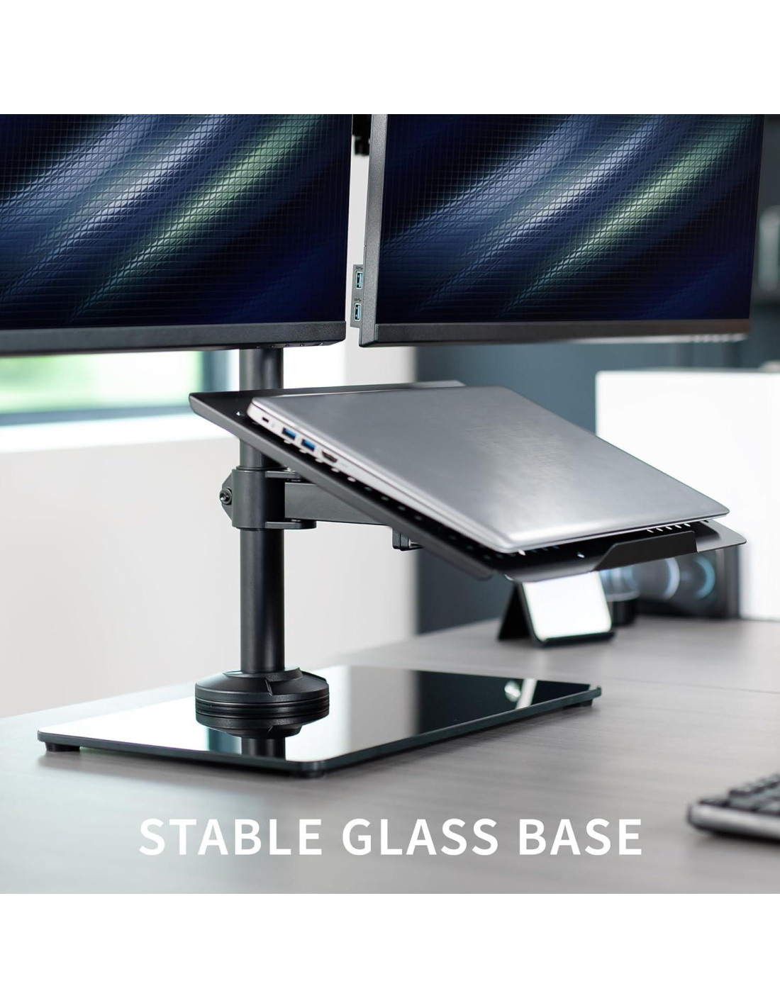 No es necesario instalar nada en su mesa con este soporte resistente. La elegante base de vidrio mantiene sus monitores y laptop seguros sin necesidad de perforar o sujetar. Con inclinación, giro, rotación y ajuste de altura, puede encontrar ángulos de visualización óptimos que aumentan la comodidad laboral. El soporte cuenta con inclinación de +90 a -90, giro de 360 y rotación de 360 para una visualización ergonómica. La bandeja metálica ventilada mejora el flujo de aire general para su laptop, ayudando a mantenerla fresca. Proporciona un excelente soporte para configuraciones de pantalla dual y le evita tener que perforar su escritorio. Los clips de cable desmontables mantienen sus cables organizados. Se ajusta para brindarle ángulos de escritura y visualización cómodos. Soporta una laptop individual de hasta 17" (43.18 cm). Soporta pantallas de 13" (33.02 cm) a 32" (81.28 cm) y laptops de hasta 17" (43.18 cm).