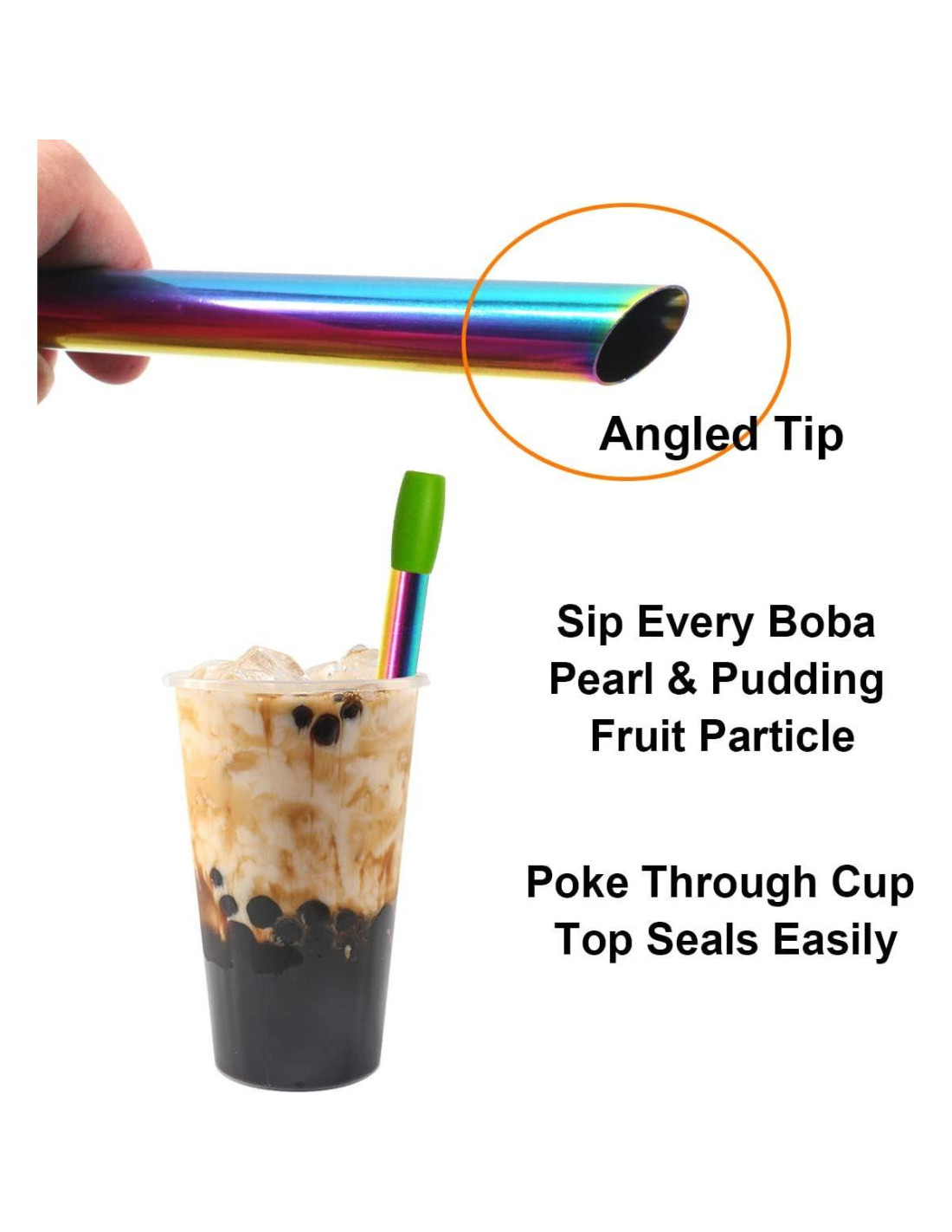 Popote de metal super ancho, adecuado para boba, té con leche, jumbo, té de burbujas, perlas de tapioca, batido, batidos, granizados, bebidas congeladas. 10" (25.4 cm) Extra largo, ideal para tazas de 30/40 oz (887/1135 ml). Puntas Anguladas, Sorber perlas de boba más fácil, Perforar a través de los sellos de la parte superior de la taza fácilmente. Las puntas de silicona protegerán tus labios y dientes. Hecho de Acero Inoxidable 304, Apto para Lavavajillas.