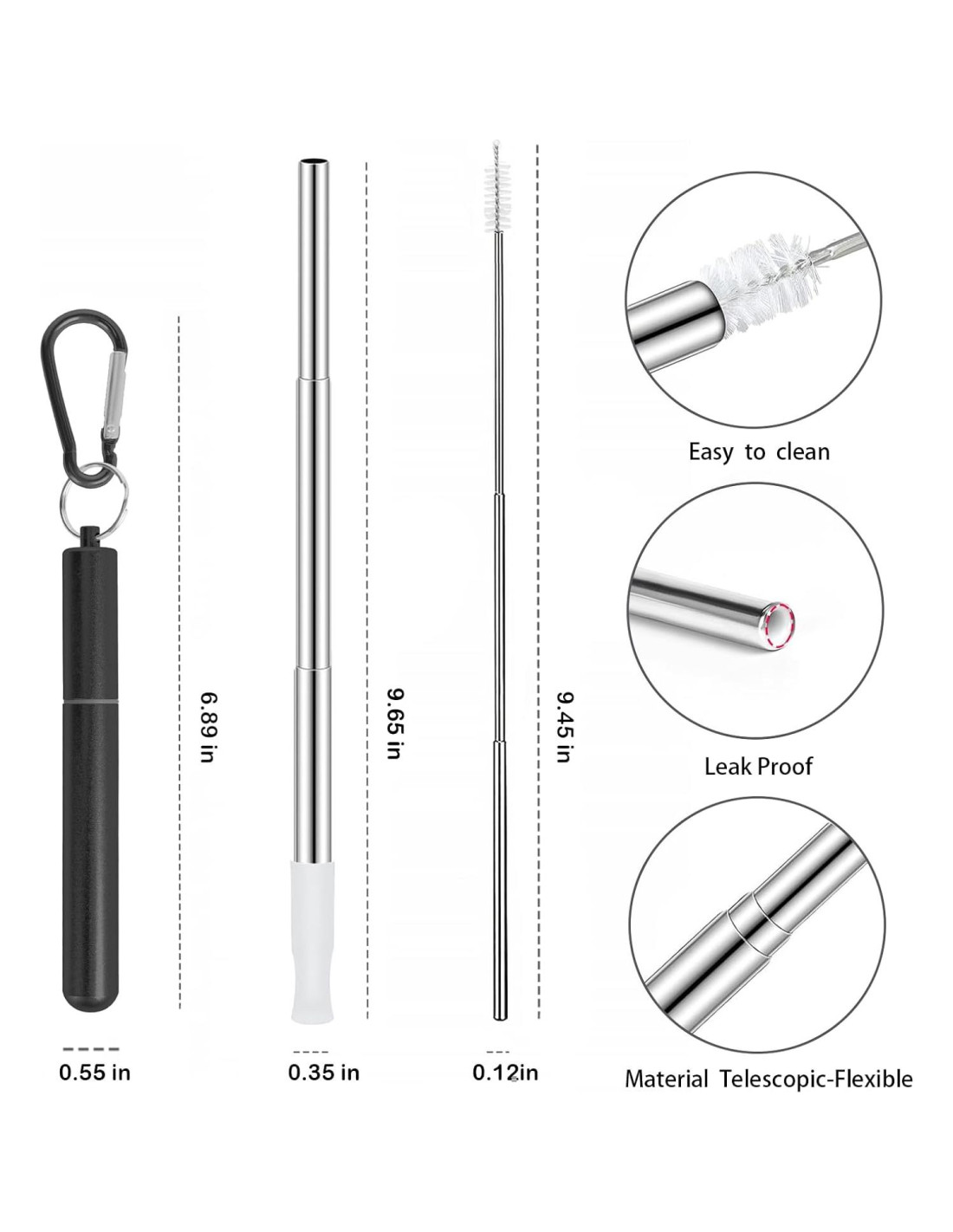 - Compacto y Portátil: El popote retráctil es reutilizable y viene con una caja, lo que facilita su transporte. El pequeño y ligero contenedor puede contener cepillos de limpieza y popotes, colocándose cómodamente en la mano, bolsillo, consola del auto o llavero
