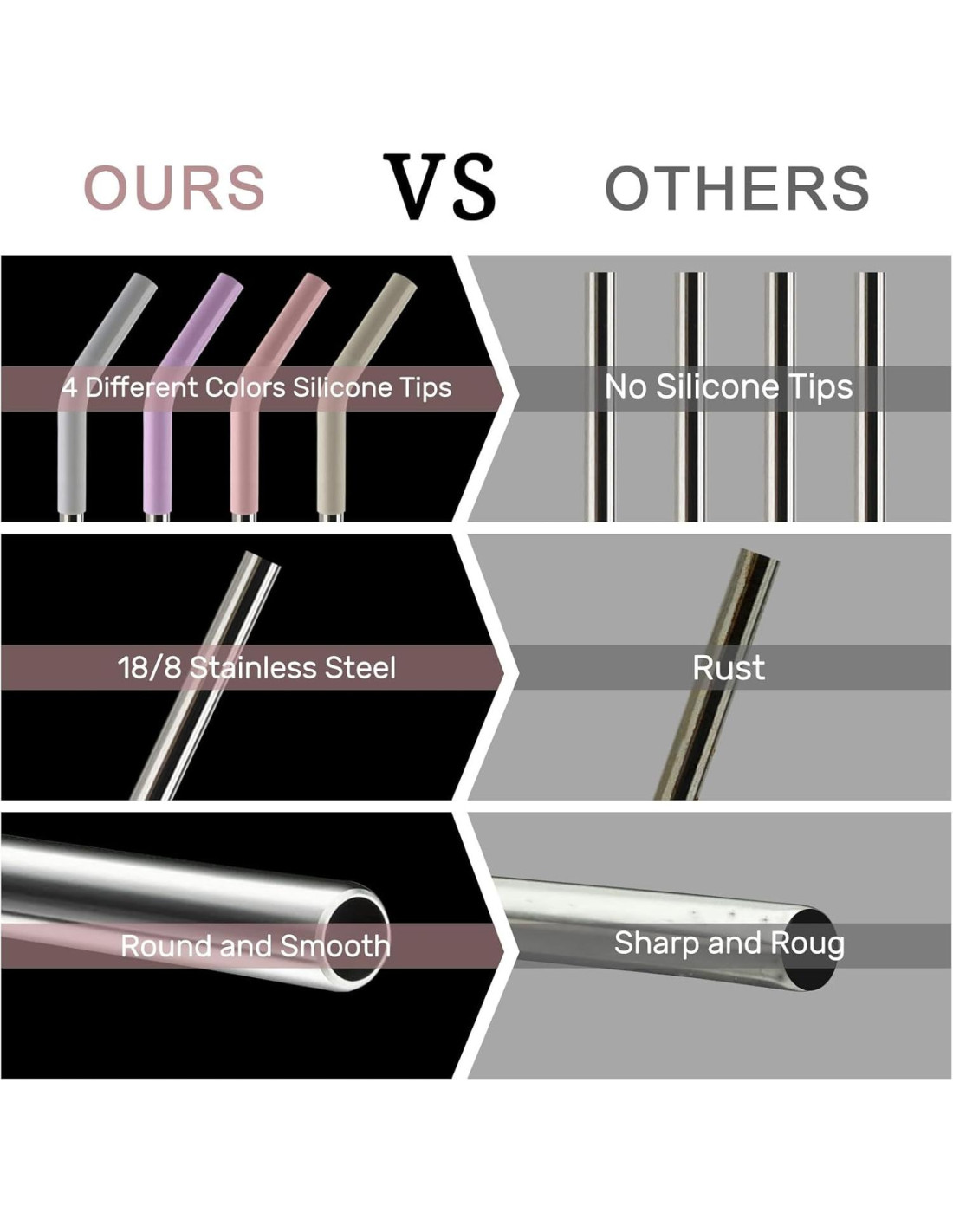 - Puntas de Silicona: Nuestros popotes están emparejados con puntas de silicona de grado alimenticio para una experiencia de sorbo segura y cómoda. Las puntas de silicona suaves y flexibles aseguran un toque suave mientras previenen cualquier daño potencial a tus dientes o labios